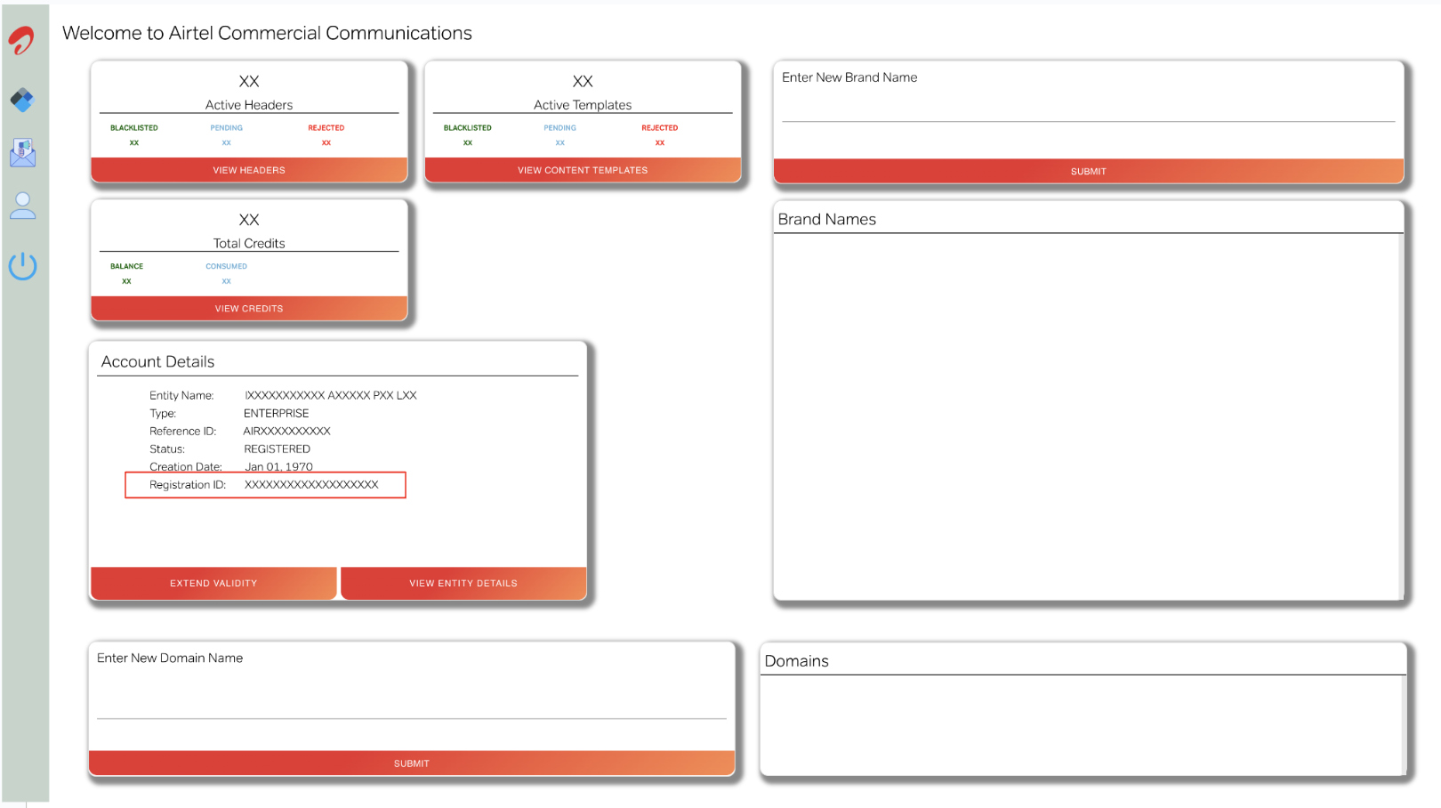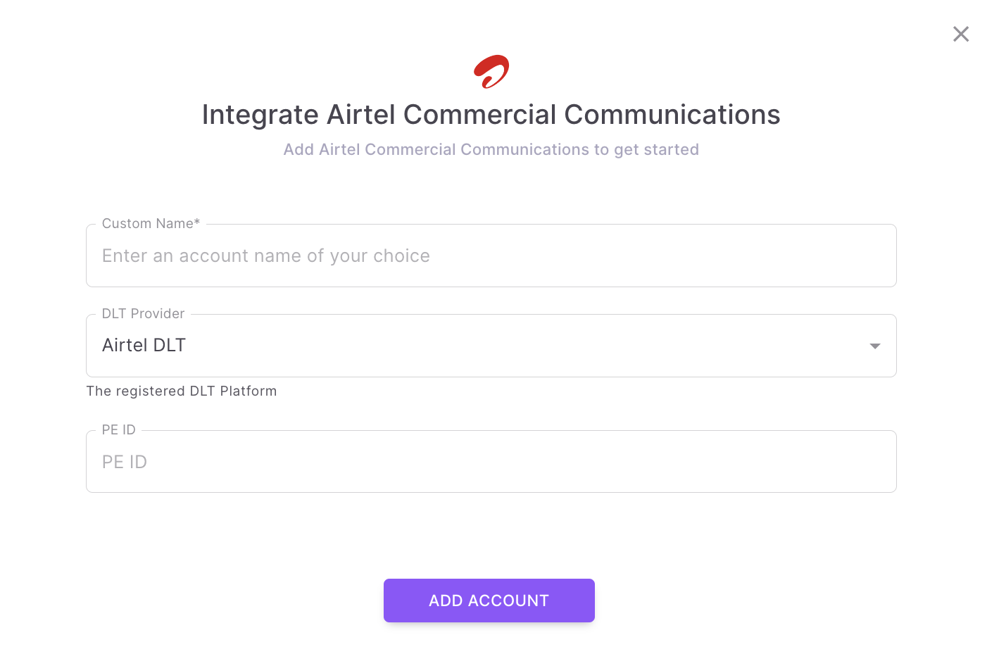 Core FeaturesIntegrationsDLTAirtel Commercial CommunicationsCopy pageApplicable only if your business is operating in India To setup a Airtel DLT account already set up, follow the below steps . 1Find the ProviderNavigate to Integrations -> DLT. Click on the “Airtel DLT” button.2Configure the IntegrationIn the below pop-up, fill in: Custom name: Provide a name that would help you identify the configured account in Fyno’s portal. DLT Provider: ‘Airtel DLT’ is pre-filled. PE ID: PE ID (Personal Entity id) can be fetched from the dashboard as shown below. 3Complete the IntegrationClick on “Add Account” once done, and you are all set!