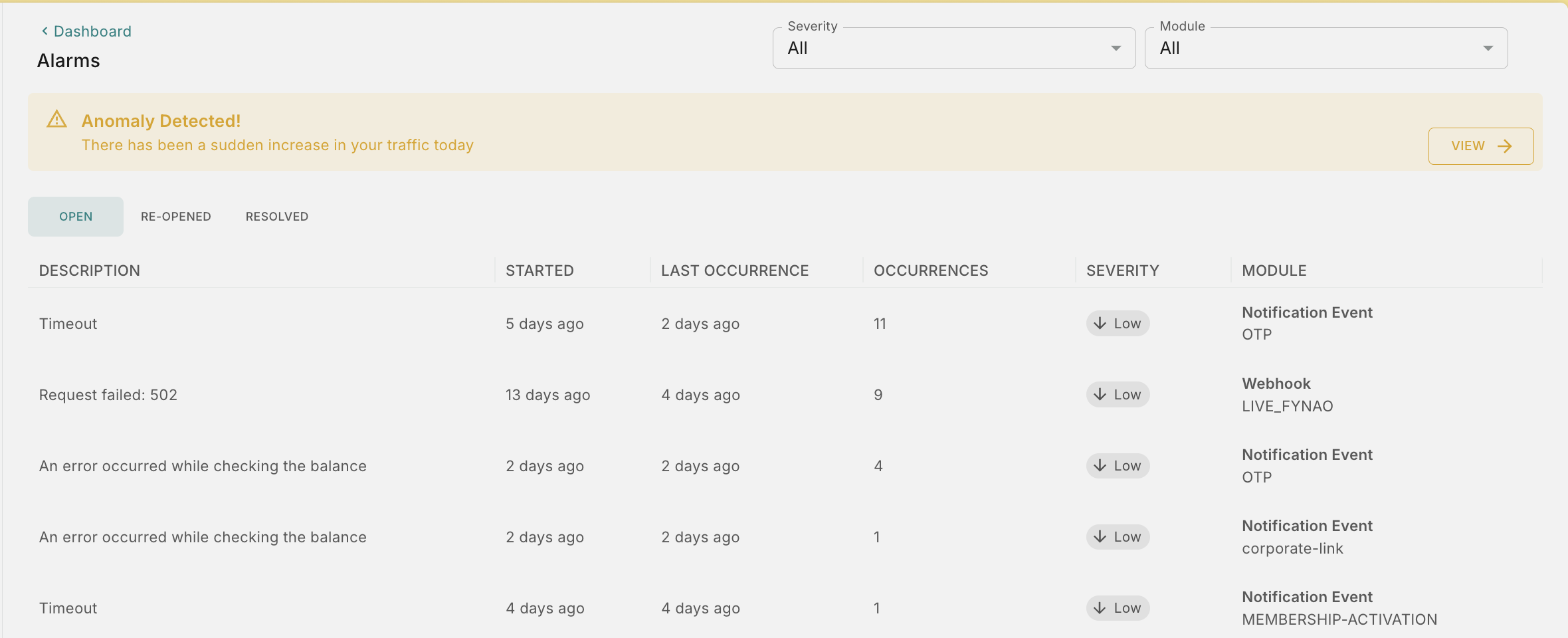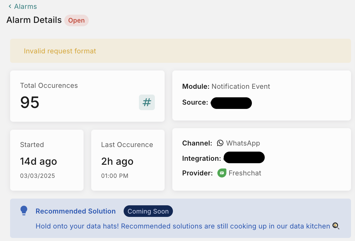Fyno’s Alarms provides a comprehensive summary of all issues encountered while delivering notifications to your users. These alarms are classified into High, Medium, Low and Info categories based on severity, allowing you to prioritize your response. We recommend addressing these issues promptly to enhance your overall notification deliverability and ensure your notifications reach users consistently.