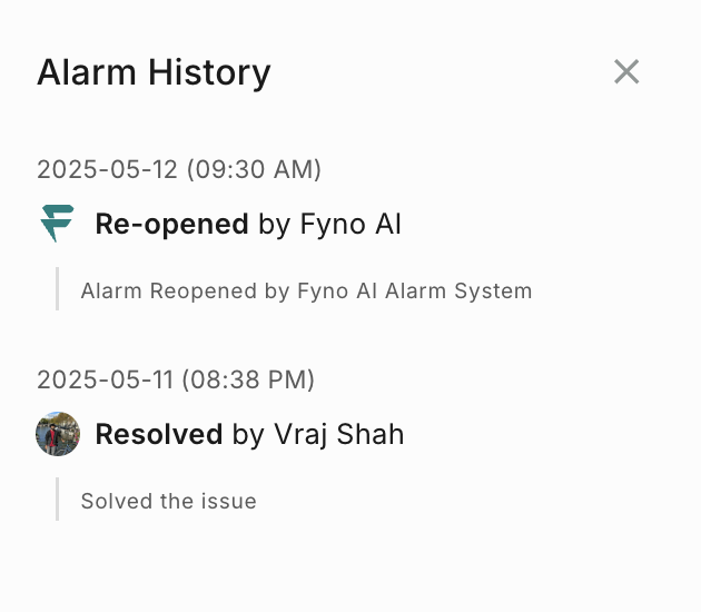 To see change logs of an alarm, click ‘Change log’ icon next to ‘Mark as Resolved’ CTA.