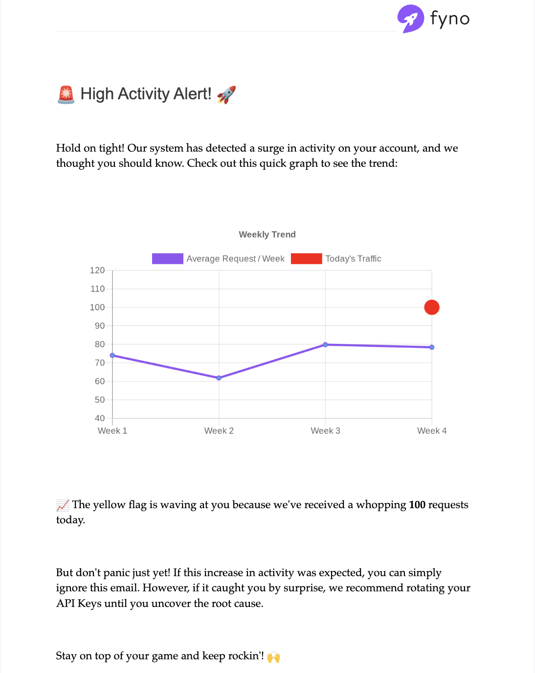 - Typically, usage of your account on a monthly basis is around 20,000 - 22,000 notifications since you have started using Fyno’s services. In the current month, however, there is a spike in your traffic (this may be expected or unexpected from your side).