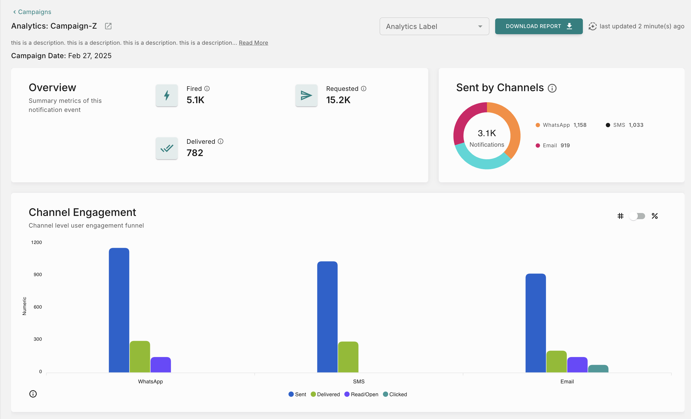 Fyno’s Campaign Analytics allows you to visualise the performance as well as gain insights into your Campaign in the form of graphs and charts in one place, which helps improve the overall experience as well as outcomes pertaining to that notification event linked to that campaign.