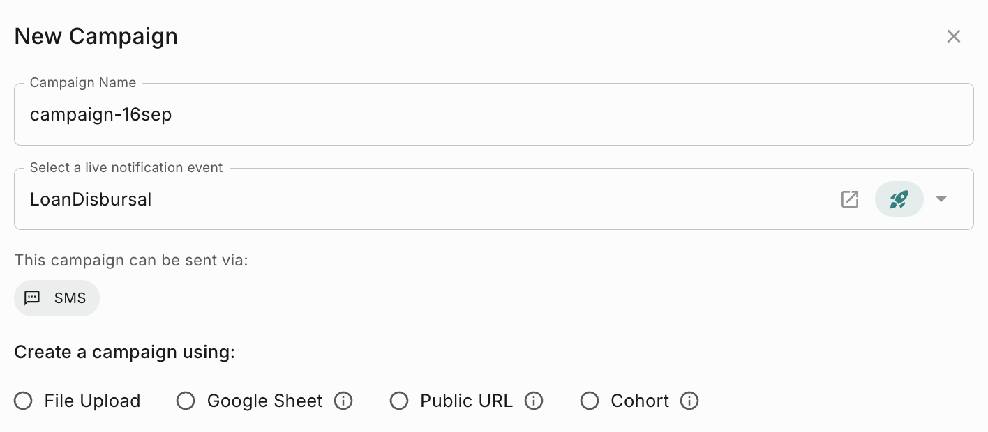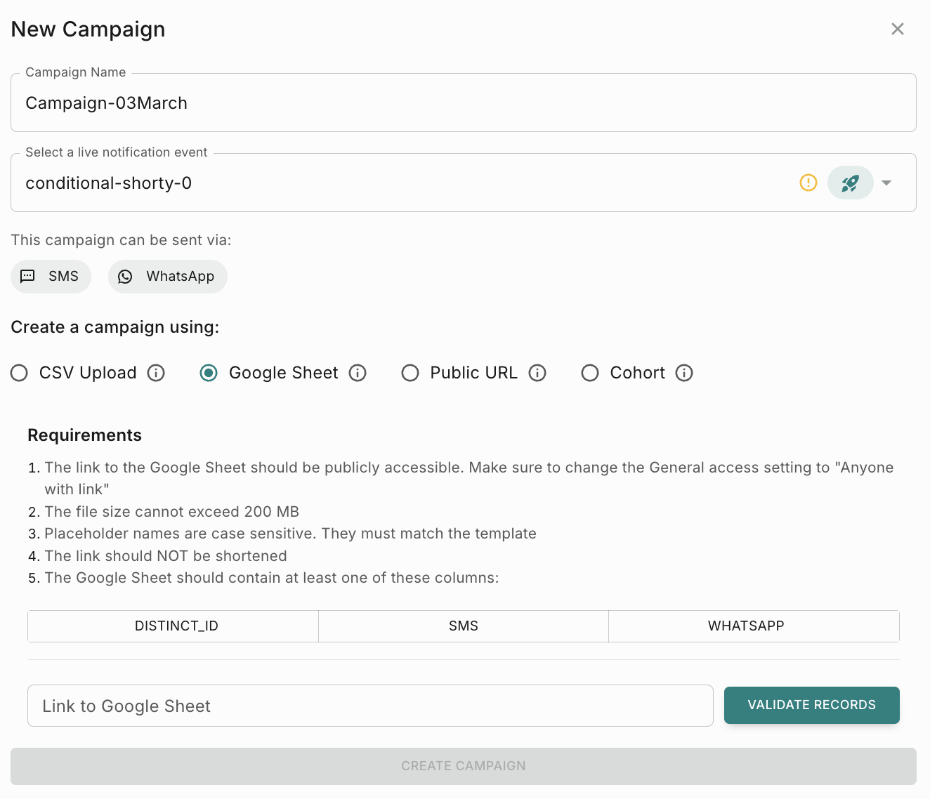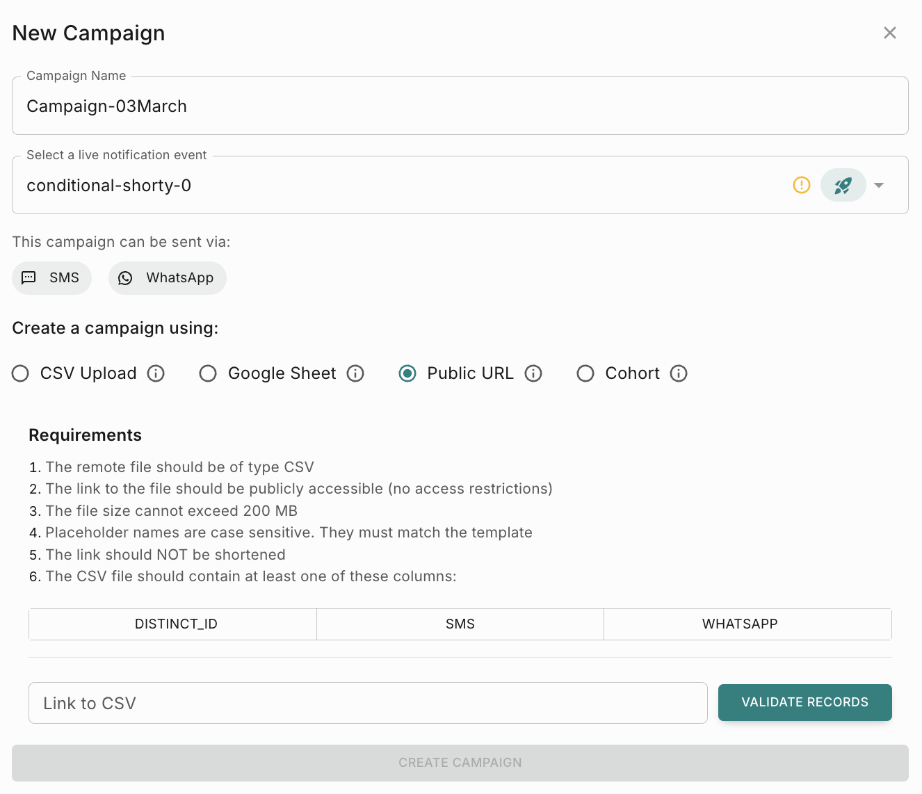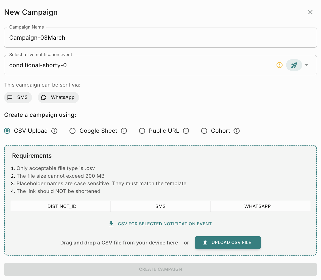 - A CSV file or xlsx file or Google sheet or Public URL or a Cohort with the user base to whom you would be triggering the campaign.