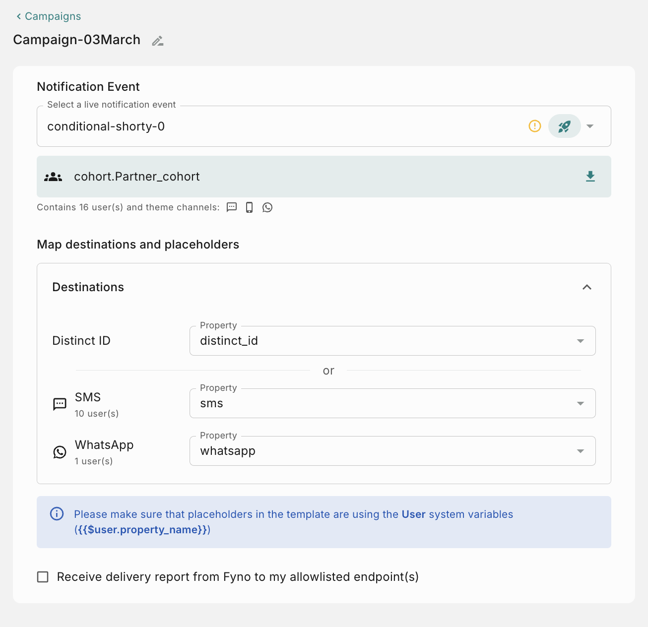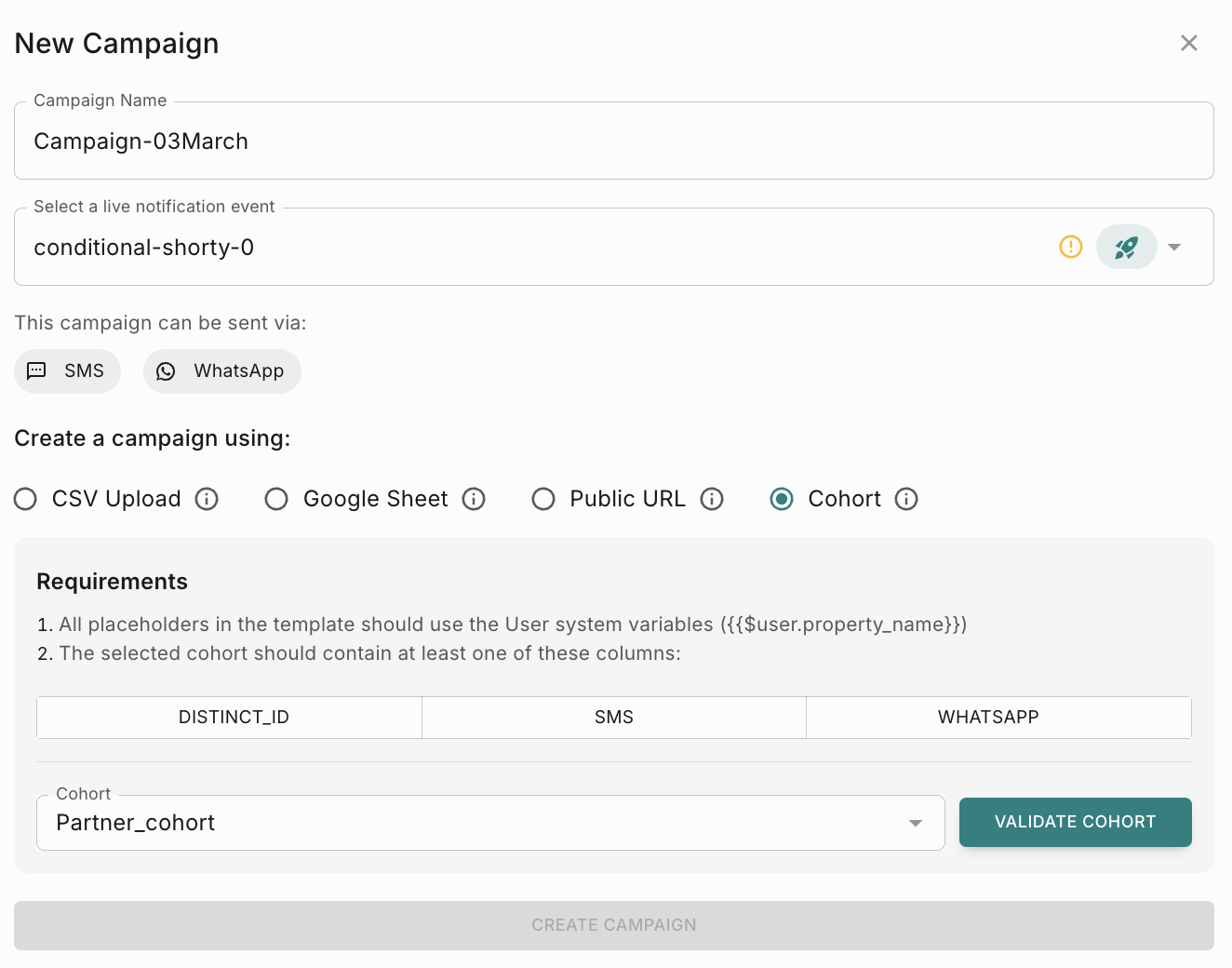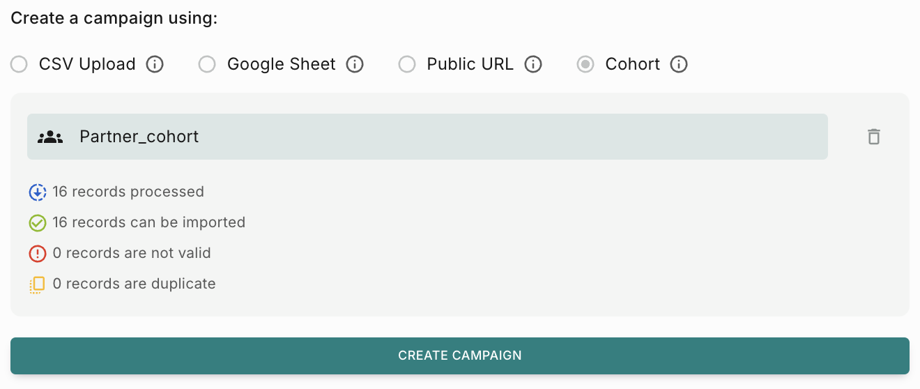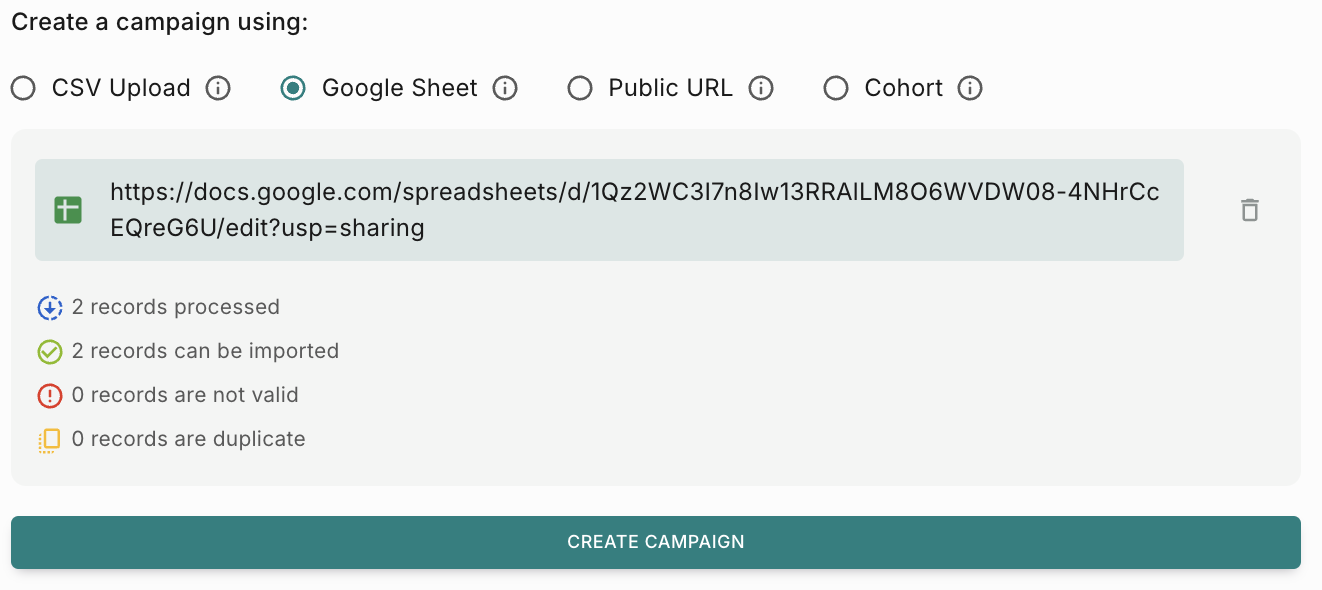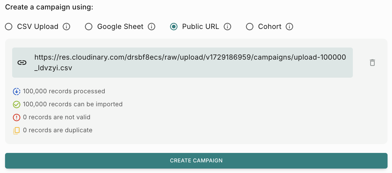 - A CSV file or xlsx file or Google sheet or Public URL or a Cohort with the user base to whom you would be triggering the campaign.