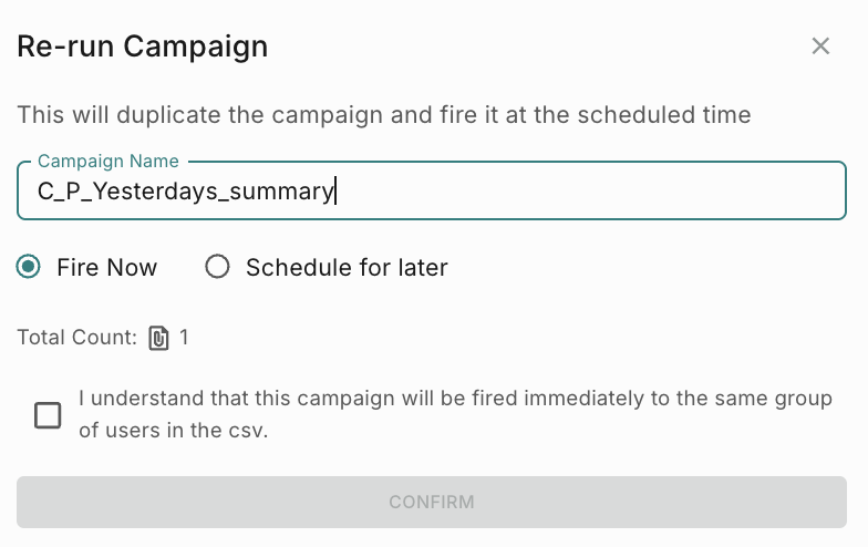 To re-run a campaign, go to the campaign page and click ‘Re-run’ at the top right corner. You will see a pop-up as shown.