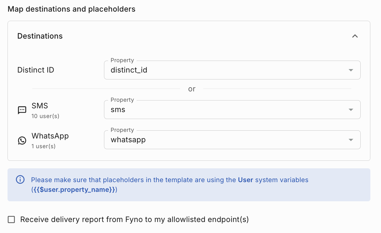 To enable receiving delivery reports from Fyno, select the checkbox ‘Receive delivery report from Fyno to my allowlisted endpoint(s)’. This enables the callbacks for the channels and essentially sends back the delivery updates about each notification triggered. On checking this box, 3 additional placeholder details will need to be configured.