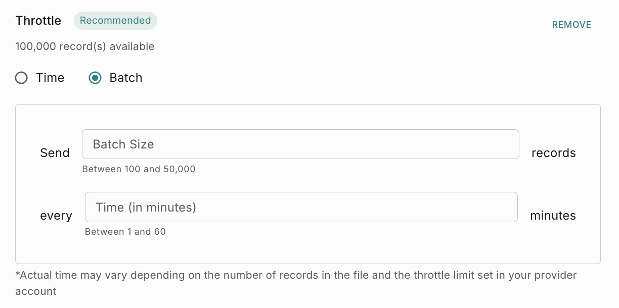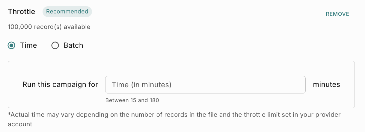 - By Batch - In this option, you can throttle the number of records the campaign should send for a specific duration. For example you want to send a execute a batch of 1000 records in the csv file every minute, then you can enter 1000 records and 1 minute