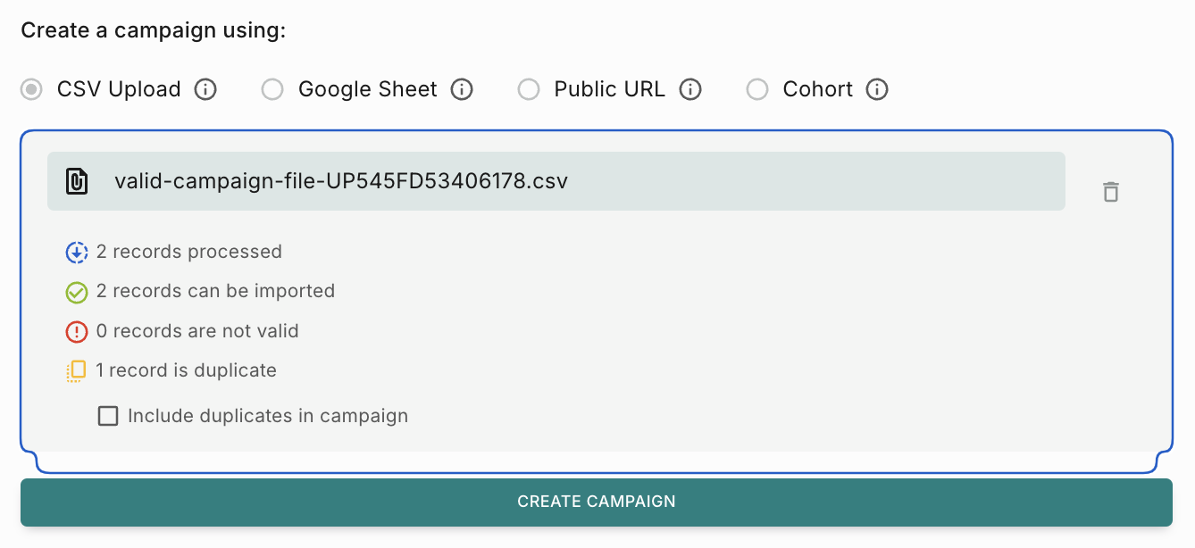 - If there are any duplicates present in the csv uploaded and if you still want to include the duplicate data, then select the checkbox ‘Include duplicates in campaign’.