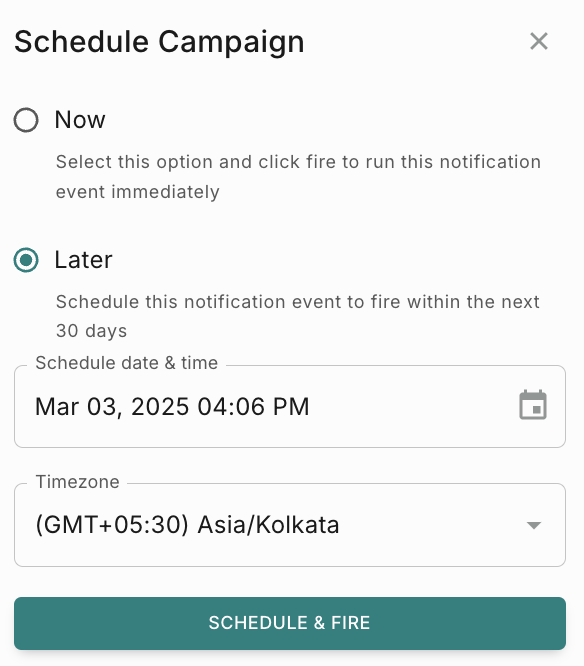 - Now - If you select Now and click ‘Fire’, the campaign will be fired immediately and your users will start getting notifications.