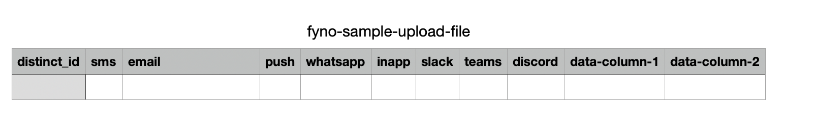 - Sample CSV file is shown below. Every record in the file should have either distinct_id or at least 1 destination. Otherwise it will show as Not Valid after uploading the file.
