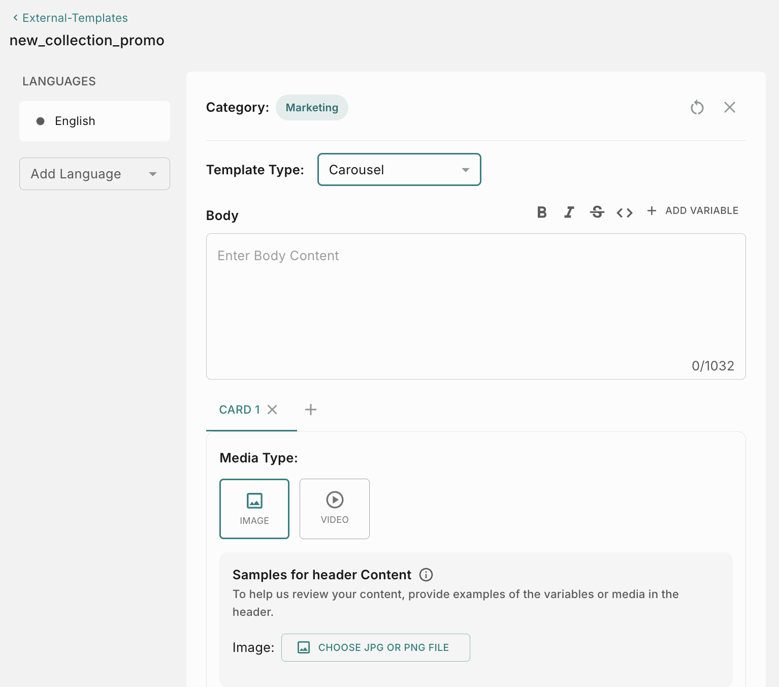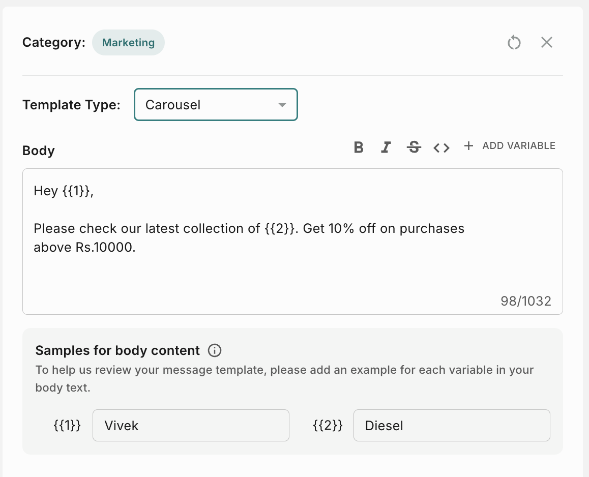 Body - Enter the text for your message in the language that you’ve selected. Maximum limit is 160 characters without variables and with each variable added it increases by 4. For example, if you have 2 variables in body content, then maximum character limit is 168.