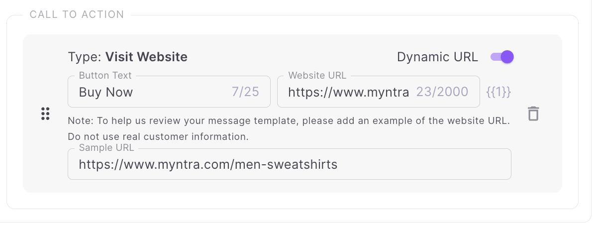 - Call to Action - Allows your customers to Visit a Website URLs in Call-to-Action buttons can either be static or dynamic. If you want to use dynamic URLs, you will need to provide the static part of your URL along with the sample URL when submitting your Message Template as shown below.
