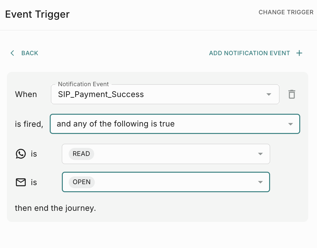 - Journey Success Criteria based on Notification Event Status - You can end Journeys based on the status of notifications. For instance, you can set up a journey to end when a user has either read the ‘SIP_Payment_Success’ notification on WhatsApp or opened the corresponding email. This can be configured as shown below:
