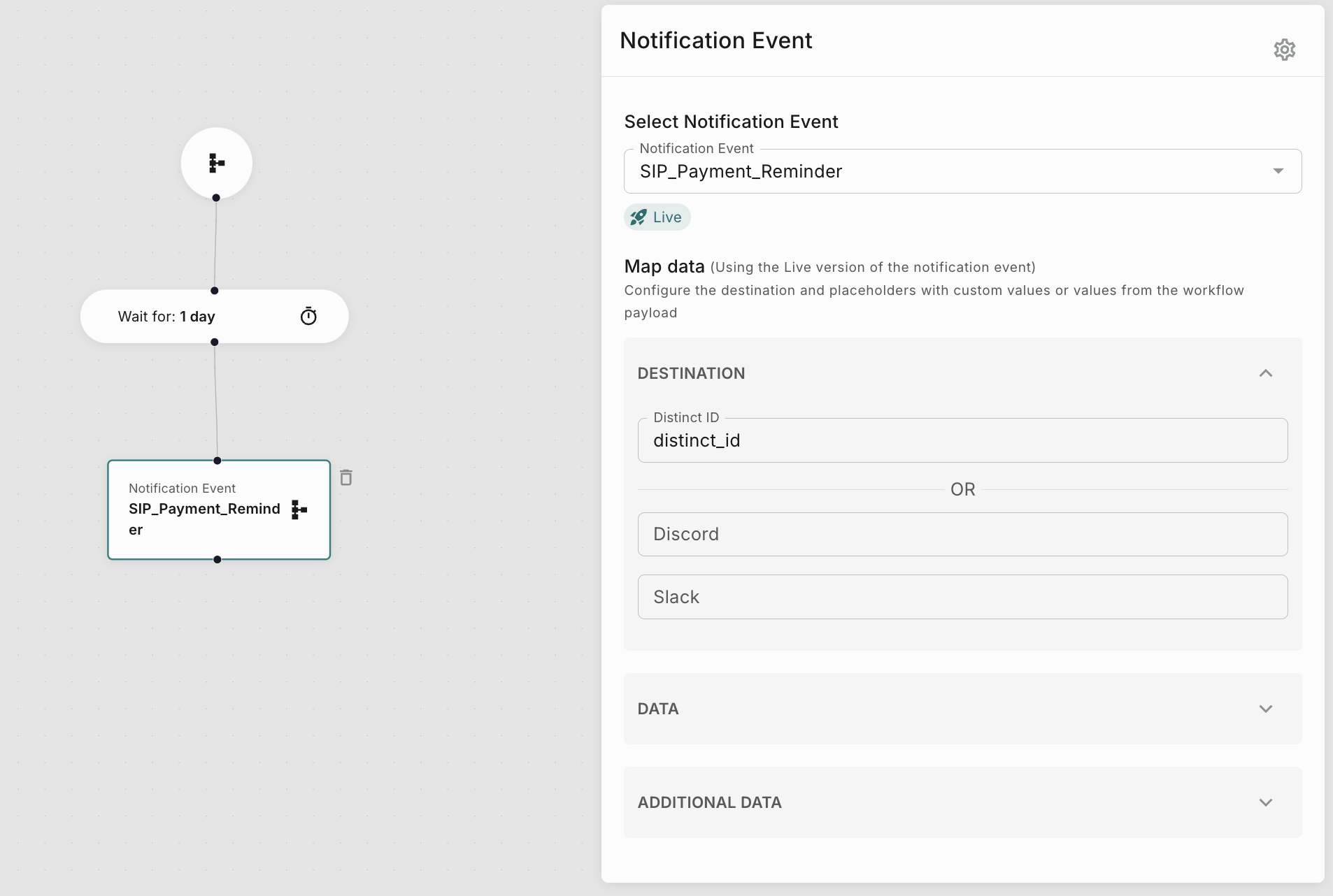 - Select Notification event you want to fire. In this case, it would be sending SIP Payment reminder.