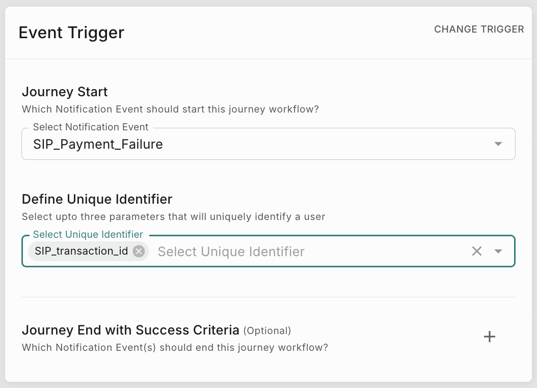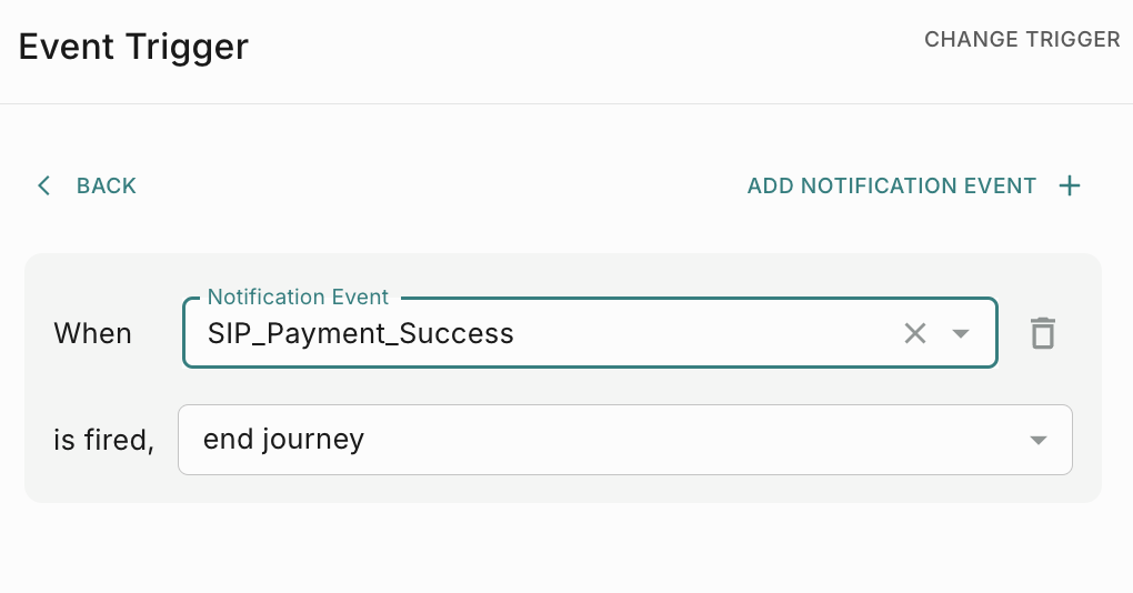 - Journey Success Criteria based on Notification Event - Select the notification event which will successfully end the journey for the user. In this use case, SIP payment success notification event will end the journey for the user.