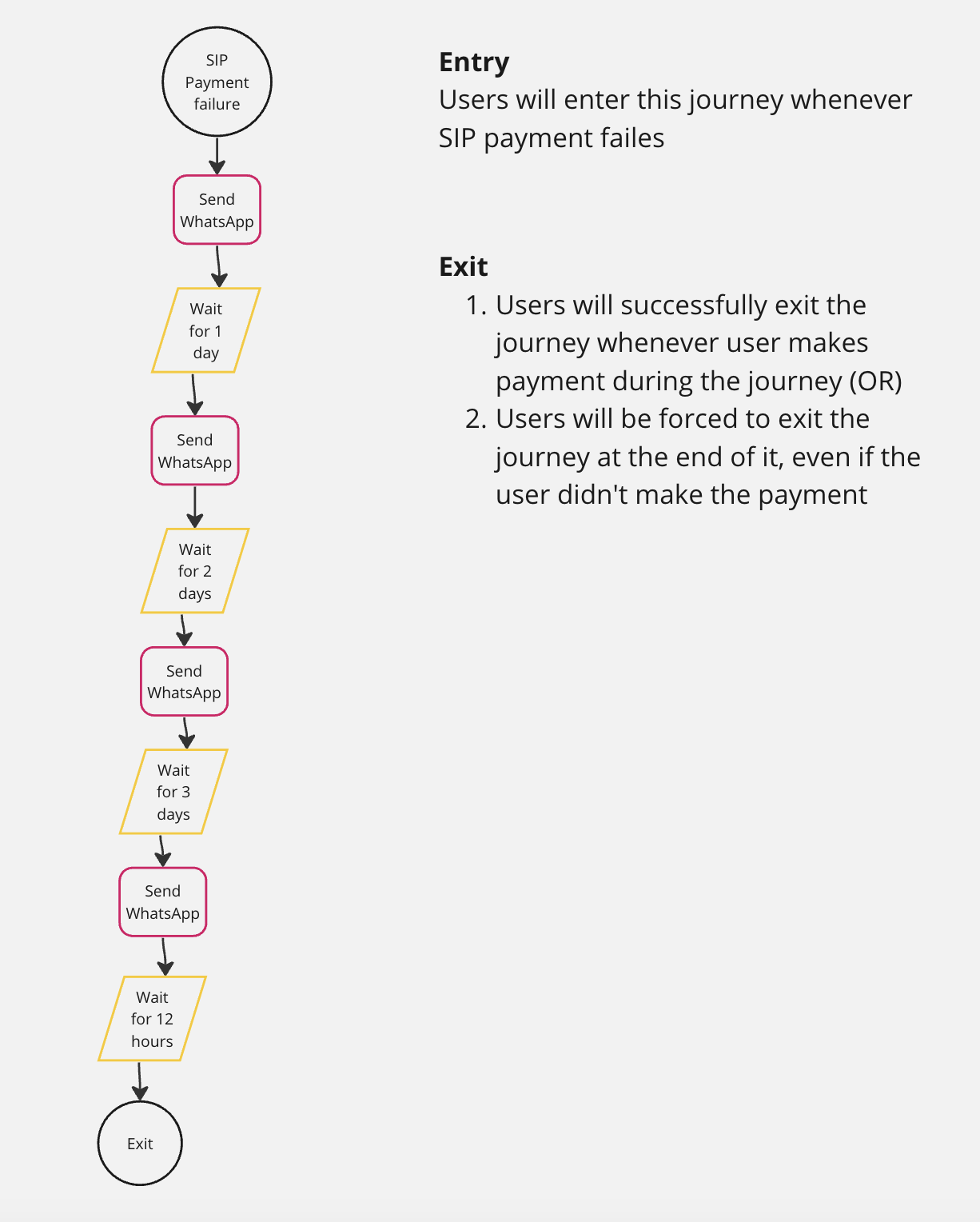 Let’s take the example of ABC, a fintech company that aims to ensure users complete their SIP payments even after an initial failure. To achieve this goal, ABC plans to implement a multi-step reminder system.