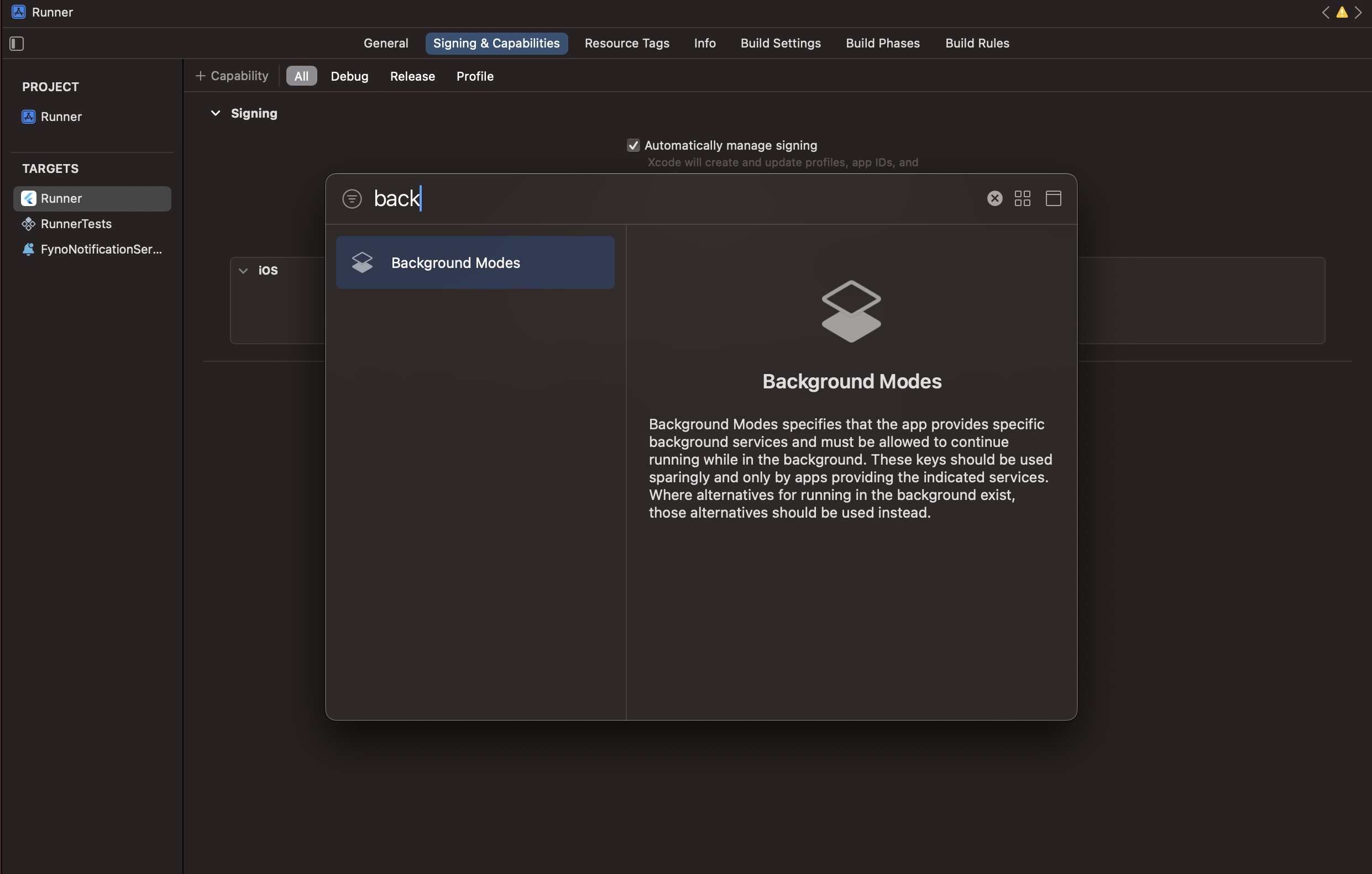 In Background Modes, select the Remote Notifications option. This is required to receive background push notifications. Learn more about background notifications here.