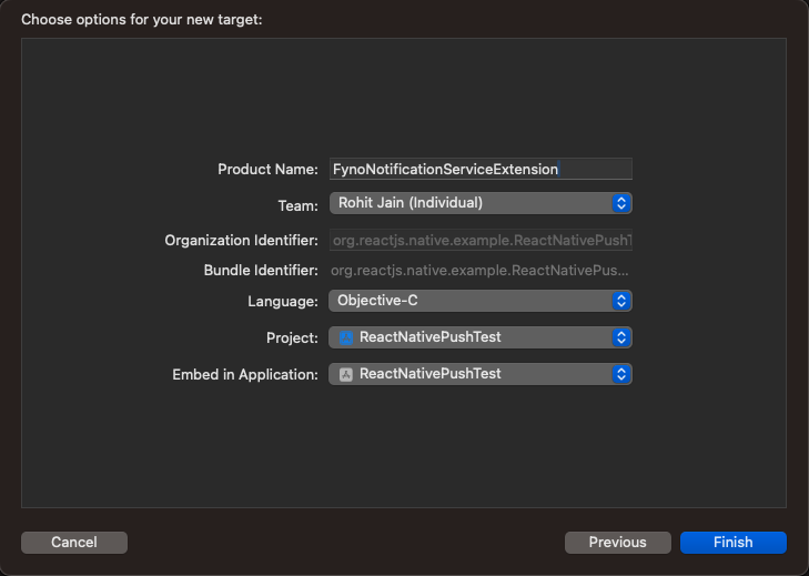 Notification Service Extensionfrom the template list. - Provide a product name, select your development team, choose the appropriate language, and click Finish.