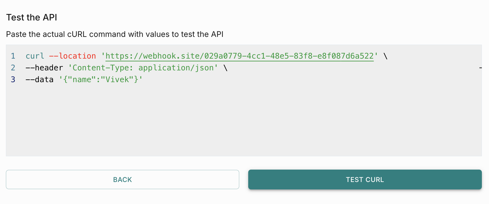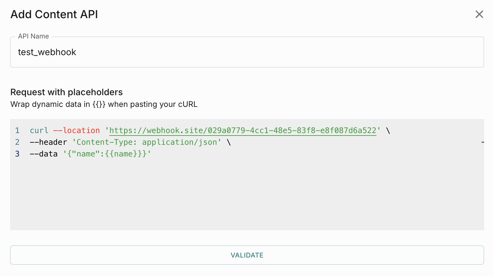 In the popup, enter a API name and add API cuRL request with placeholders (if any) and click Validate.