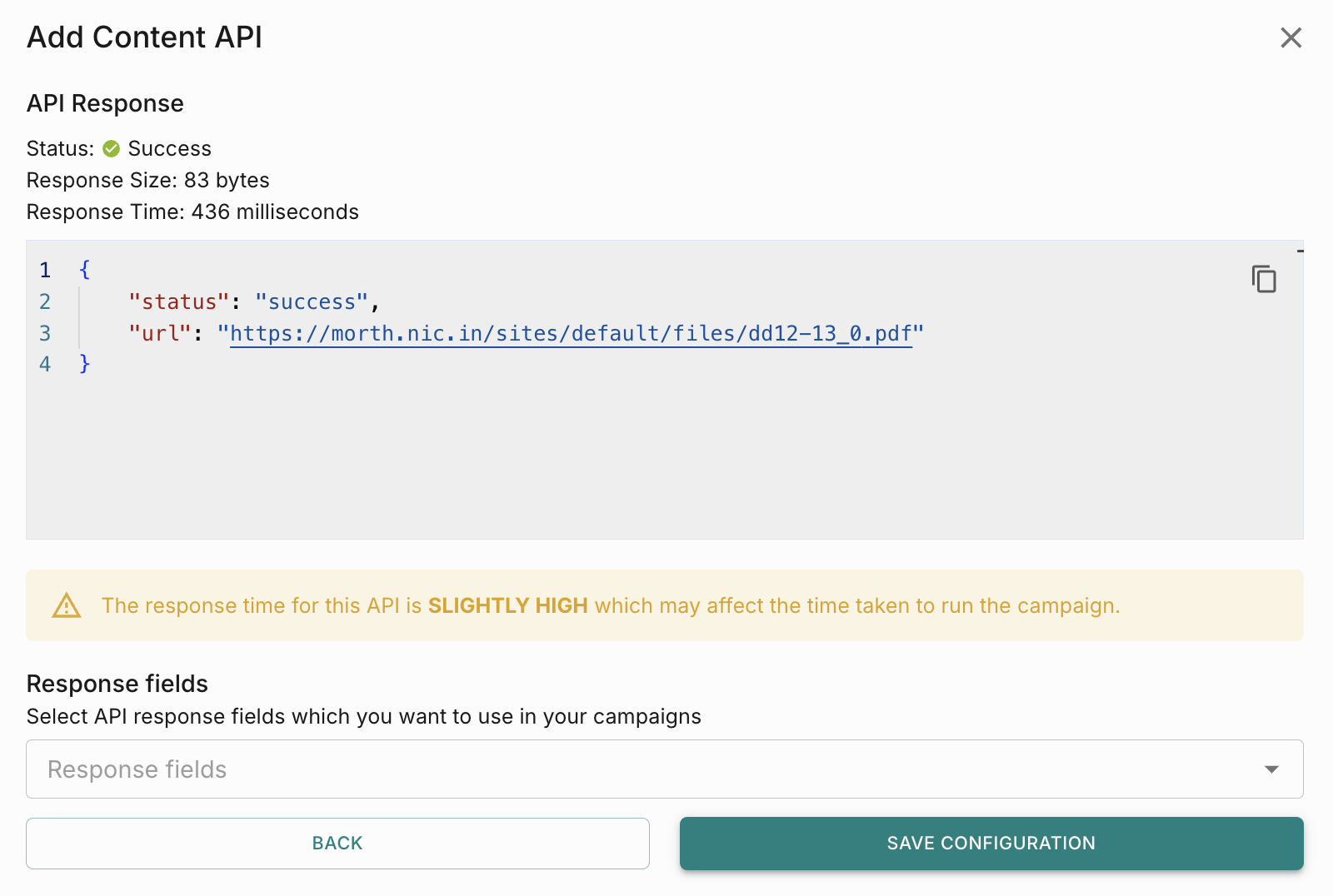 Once you have added and tested a Content API, you can use it to fetch data and use the response data in any campaigns.