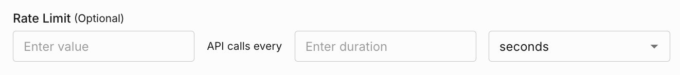 Add Rate Limit for your API. Its optional, however we recommended to add the rate limit if your API has any limitation on the no of requests it can process per second/minute/hour. You can add up to 60 API calls per second or 4000 API calls per minute or 240,000 API calls per hour.