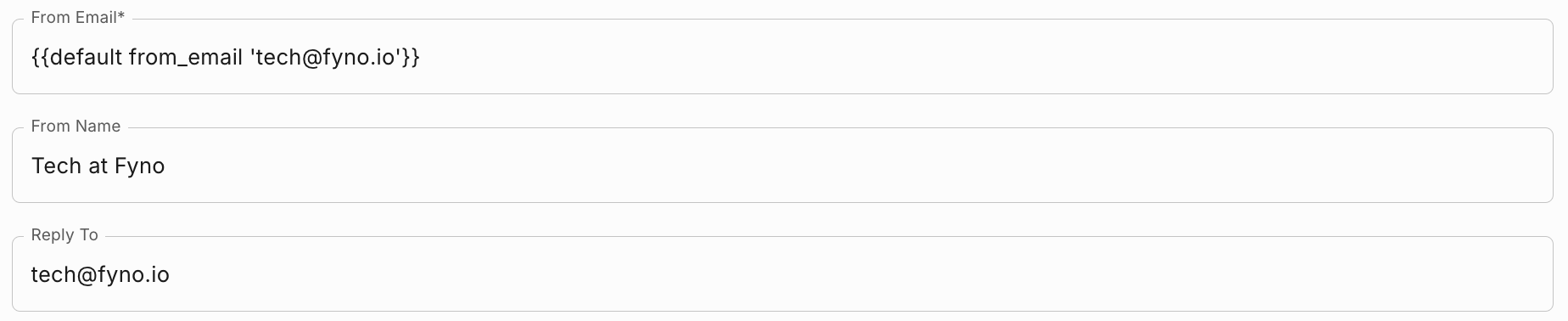 In the Notification event payload, you need to pass the from_email as shown below. By doing so, the emails triggered via this notification event will go from ‘tech@fyno.io’.