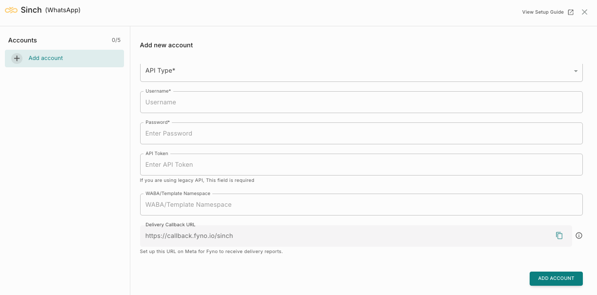 Note: All required credentials (Username, Password, API Token, WABA details) will be provided by the Sinch team upon request.