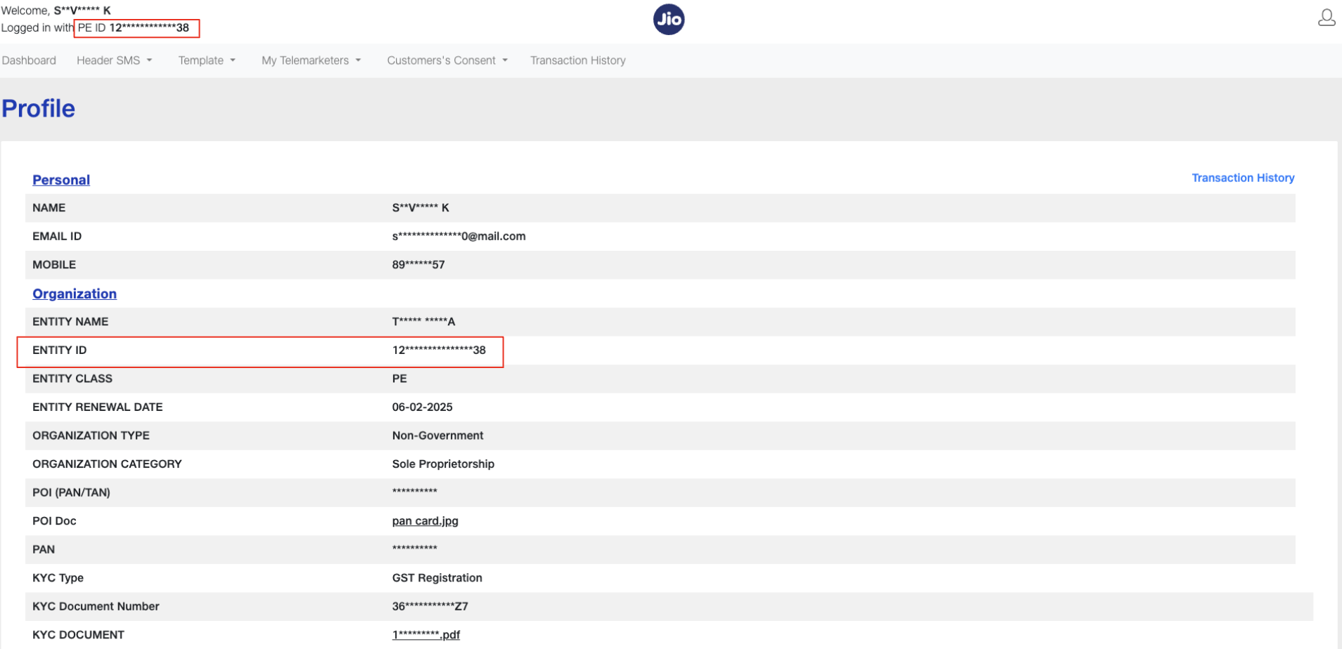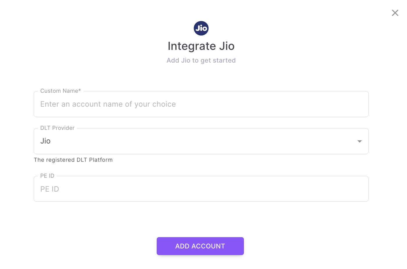 Core FeaturesIntegrationsDLTJioCopy pageApplicable only if your business is operating in India Before we get started, you will need to have a Jio DLT account already set up. 1Find the ProviderNavigate to Integrations -> DLT. Click on the “Jio” button.2Configure the IntegrationIn the below pop-up, fill in: Custom name: Provide a name that would help you identify the configured account in Fyno’s portal. DLT Provider: ‘Jio’ is pre-filled. PE Id (Private Entity Id): Go to your profile and get the PE id as shown below. 3Complete the IntegrationClick on “Add Account” once done, and you are all set!