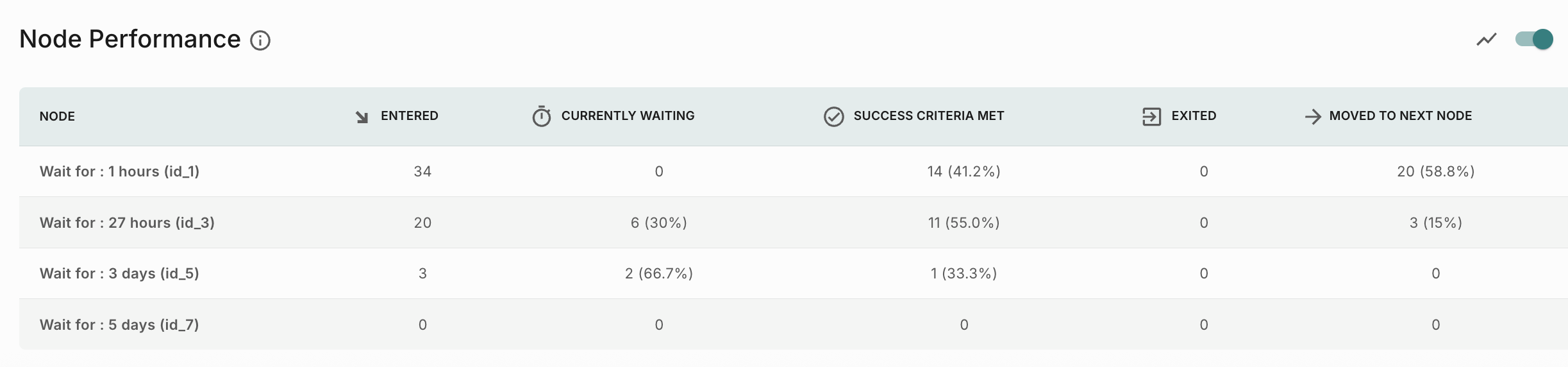 Node Performance helps to understand how each node is performing - how many users exit the journey successfully or moving to the next node.