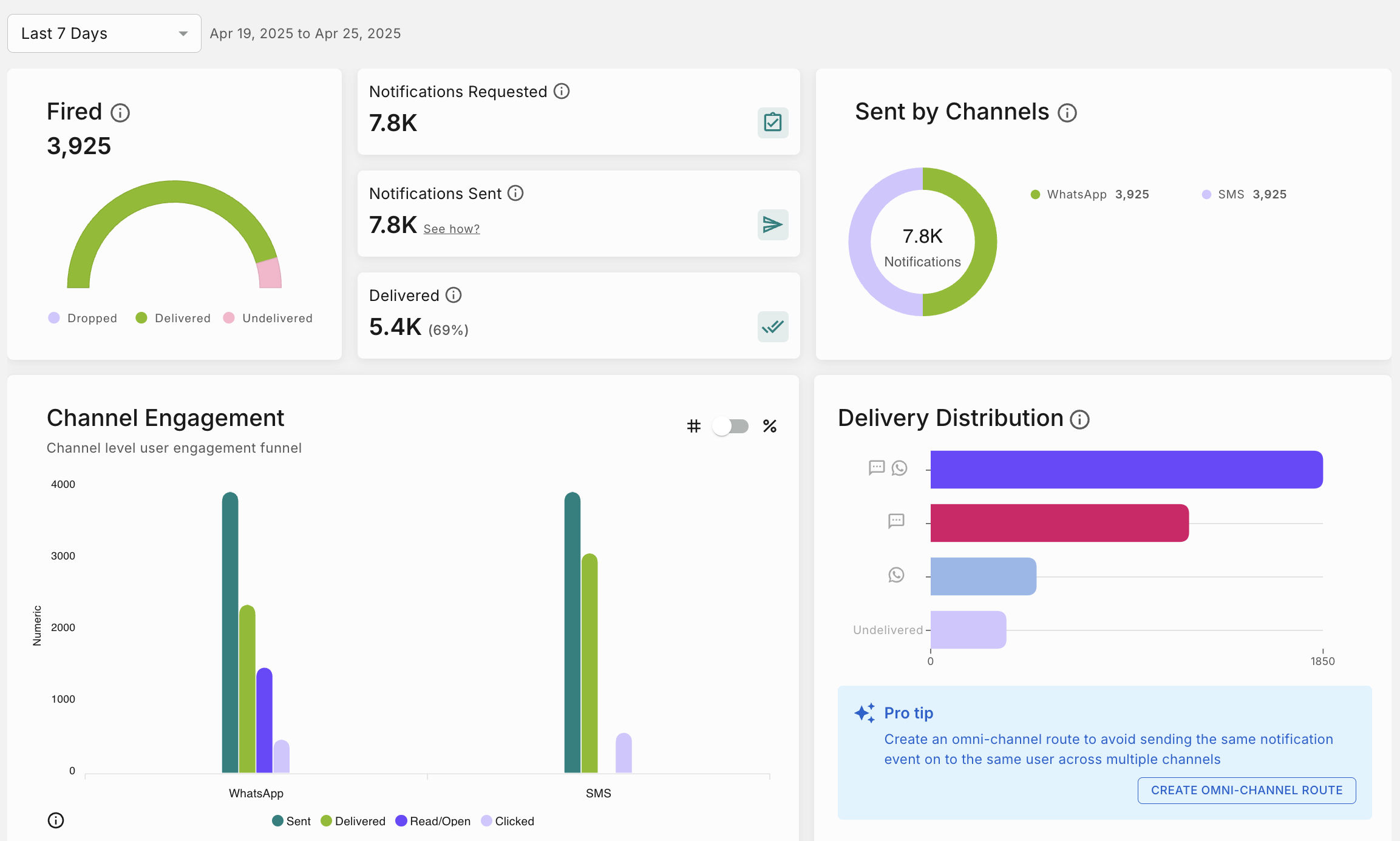 Channel Engagement provides you with a detailed view of each channel used to send out notifications along with the outcomes of the notifications sent.