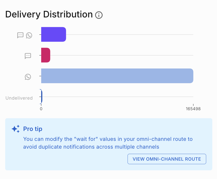 This chart explains the distribution of notifications delivered across multiple channels configured in your notification event. If you are using a Omni-channel route but still seeing lots of notifications going through multiple channels, then either you could increase the Wait time in your route or Check with your service providers, if there is any delay in sending delivery status to Fyno.