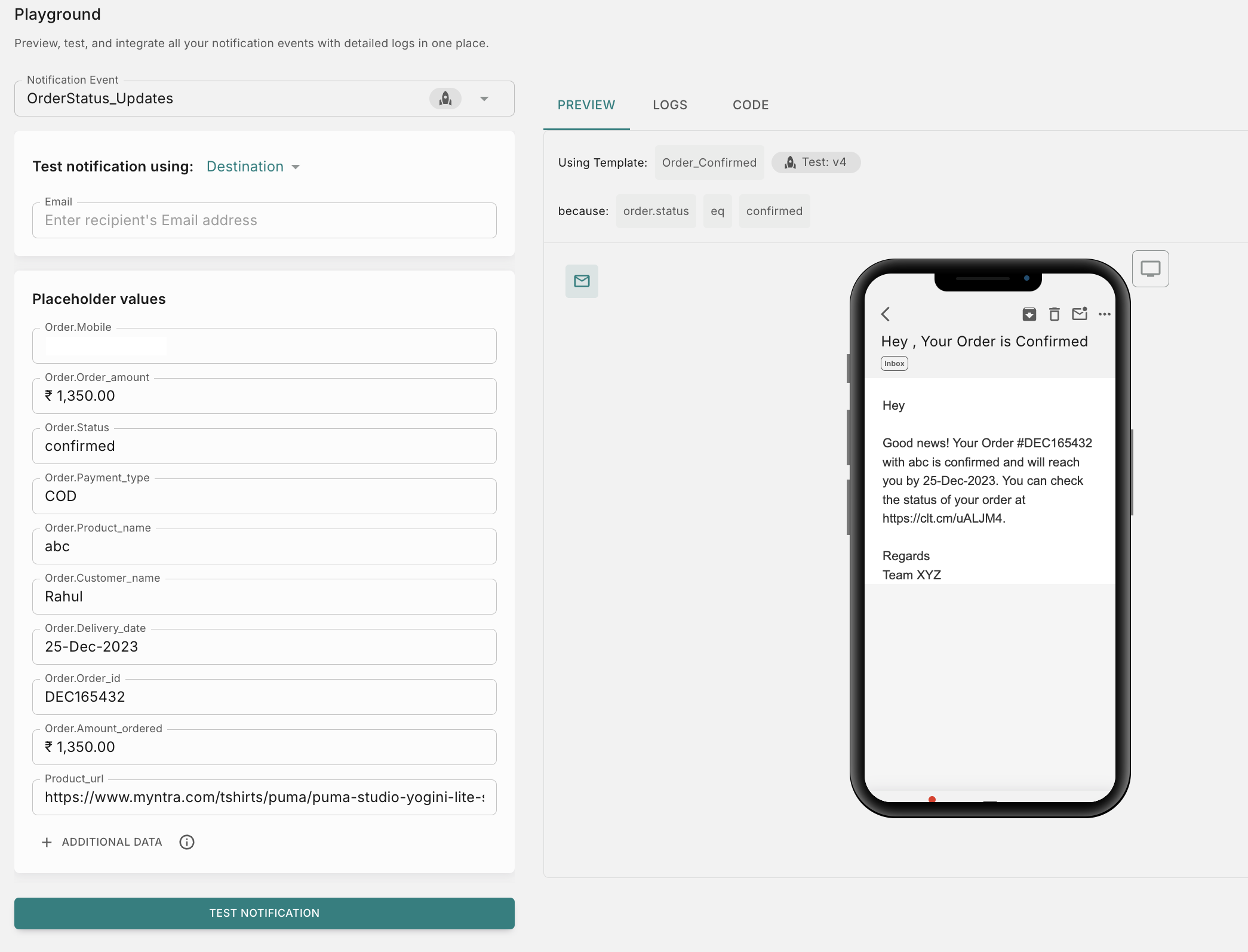 Logs: When the notification event is triggered, the logs that would be generated can be seen on the logs tab as well for a quick overview of the status.