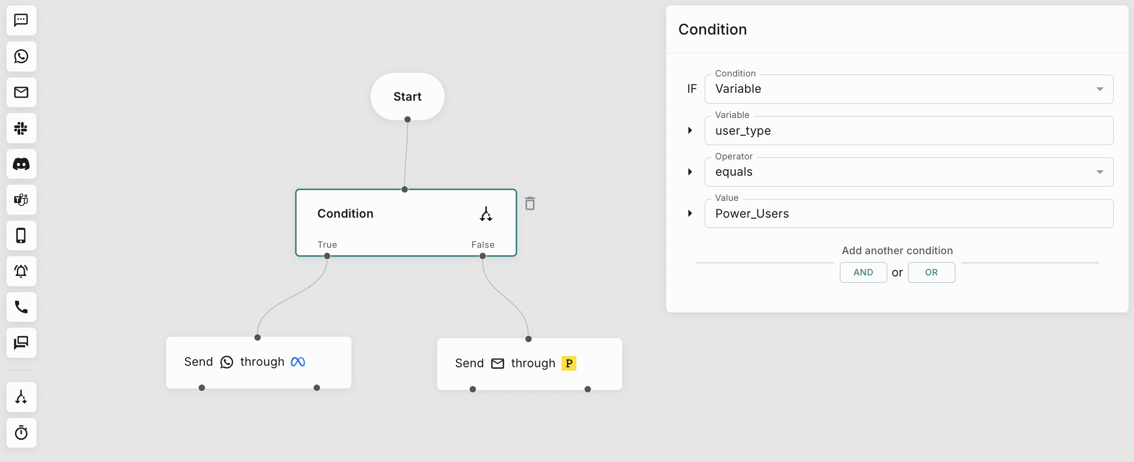 - Condition: Condition allows you to execute specific actions based on the set conditions. For example, based on user type, if you want to decide the channel, you can do it by using conditions. If the user type is Power User, then send WhatsApp else send SMS. This can be done as shown below.