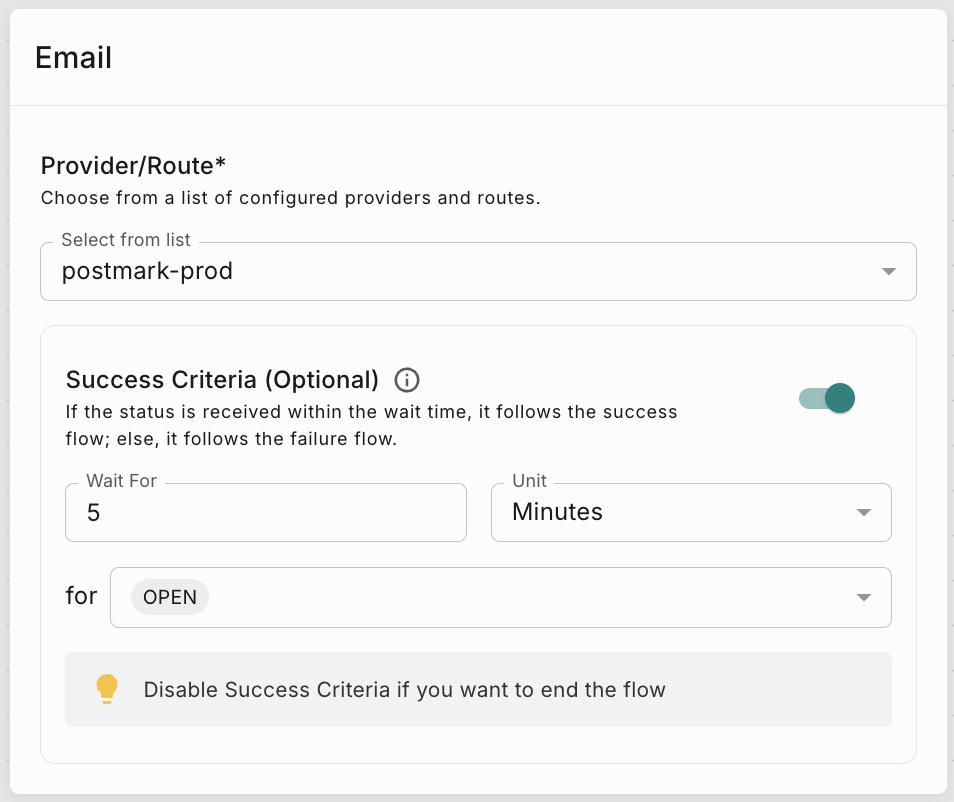 - Success Criteria - This is an optional field. You can define the status(es) that determine the Success flow and specify the wait time for these statuses.