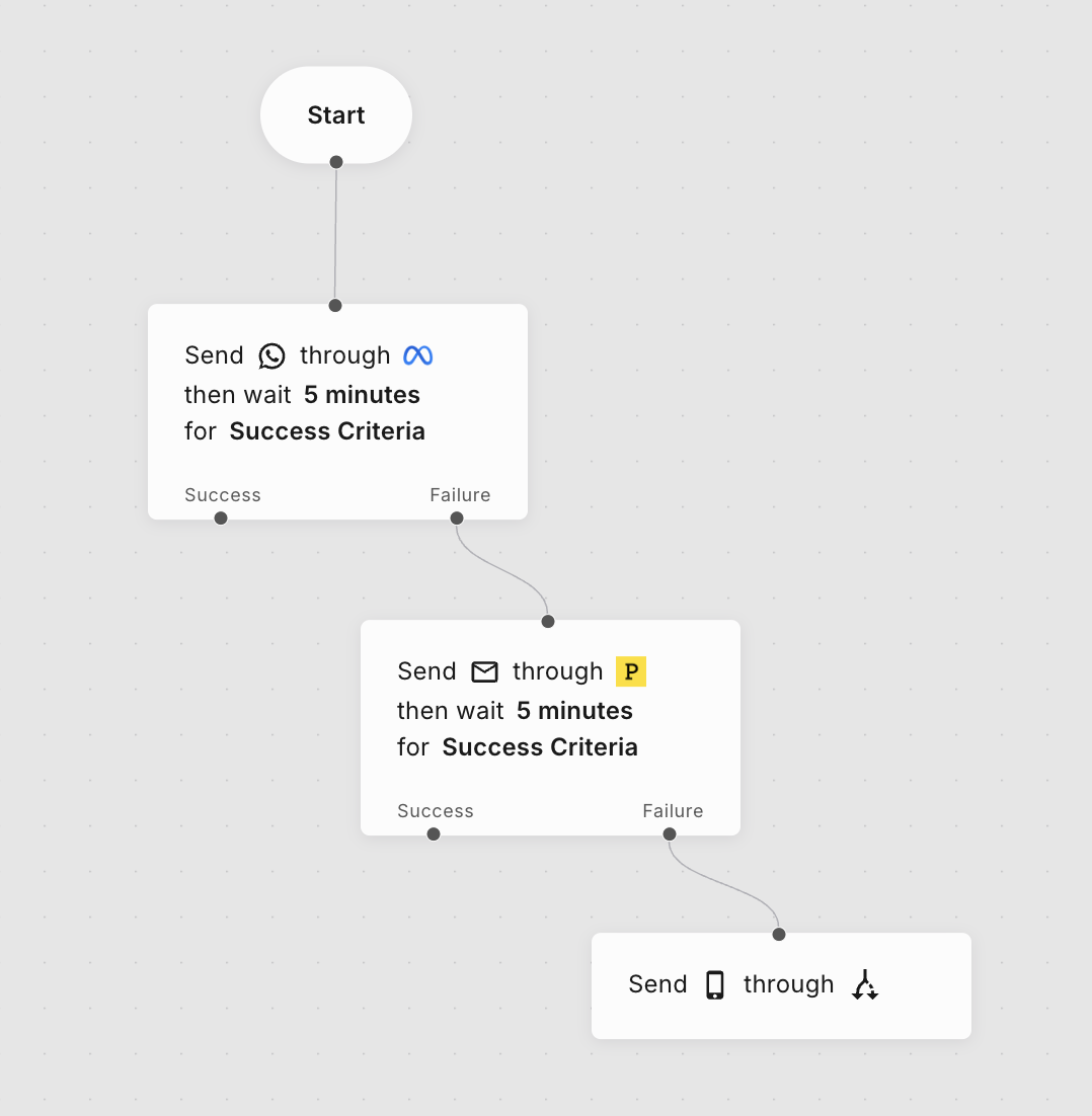 For example, a Omnichannel route is defined as follows - Send SMS, if successful, then send email, and on failure send WhatsApp. If the SMS destination is not available, it should trigger the WhatsApp as defined in the failure section.