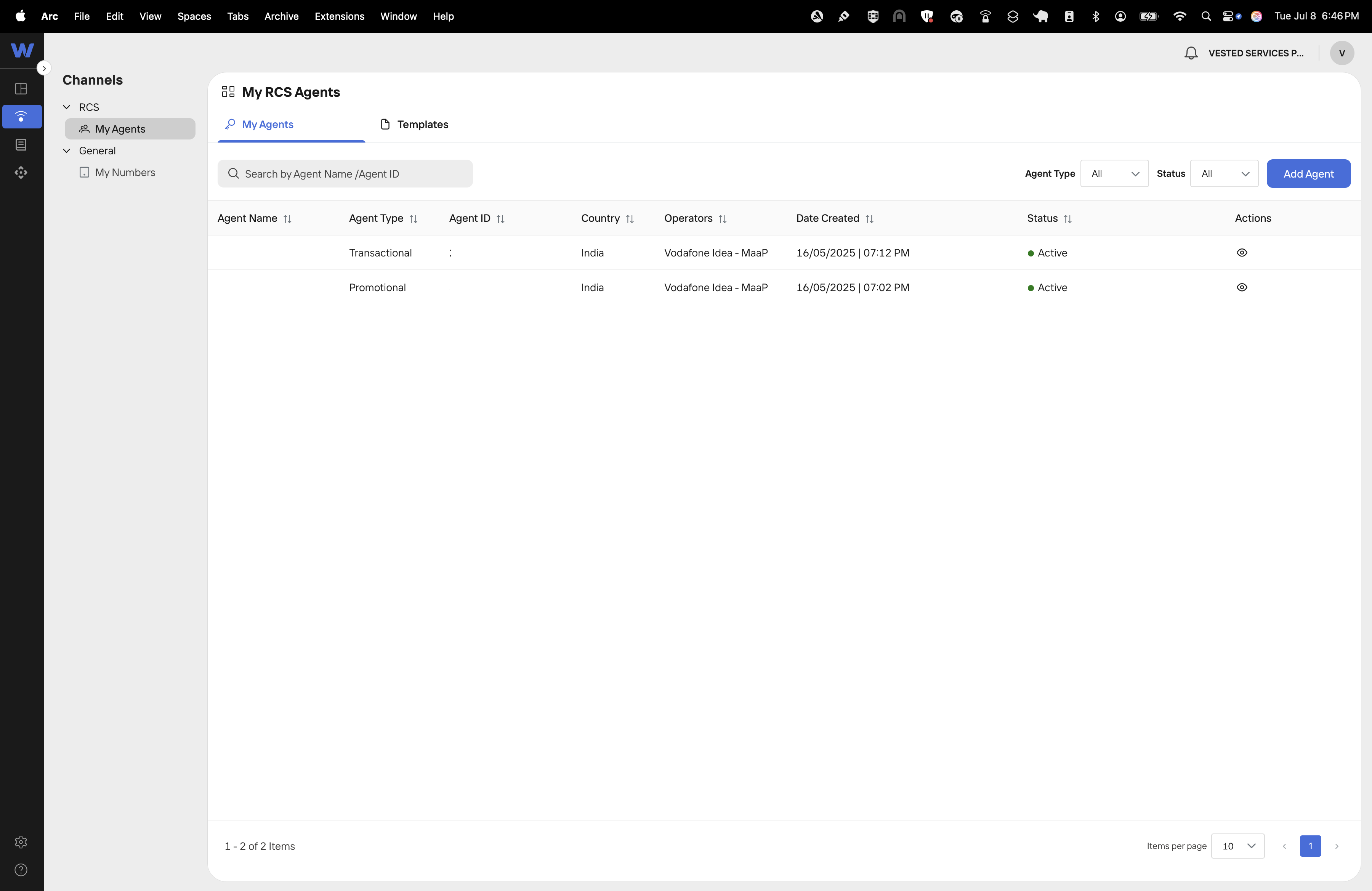 - Sender: In your Wisely account, from left nav, go to Channels -> RCS -> My Agents. Fetch the Agent Id and enter here.