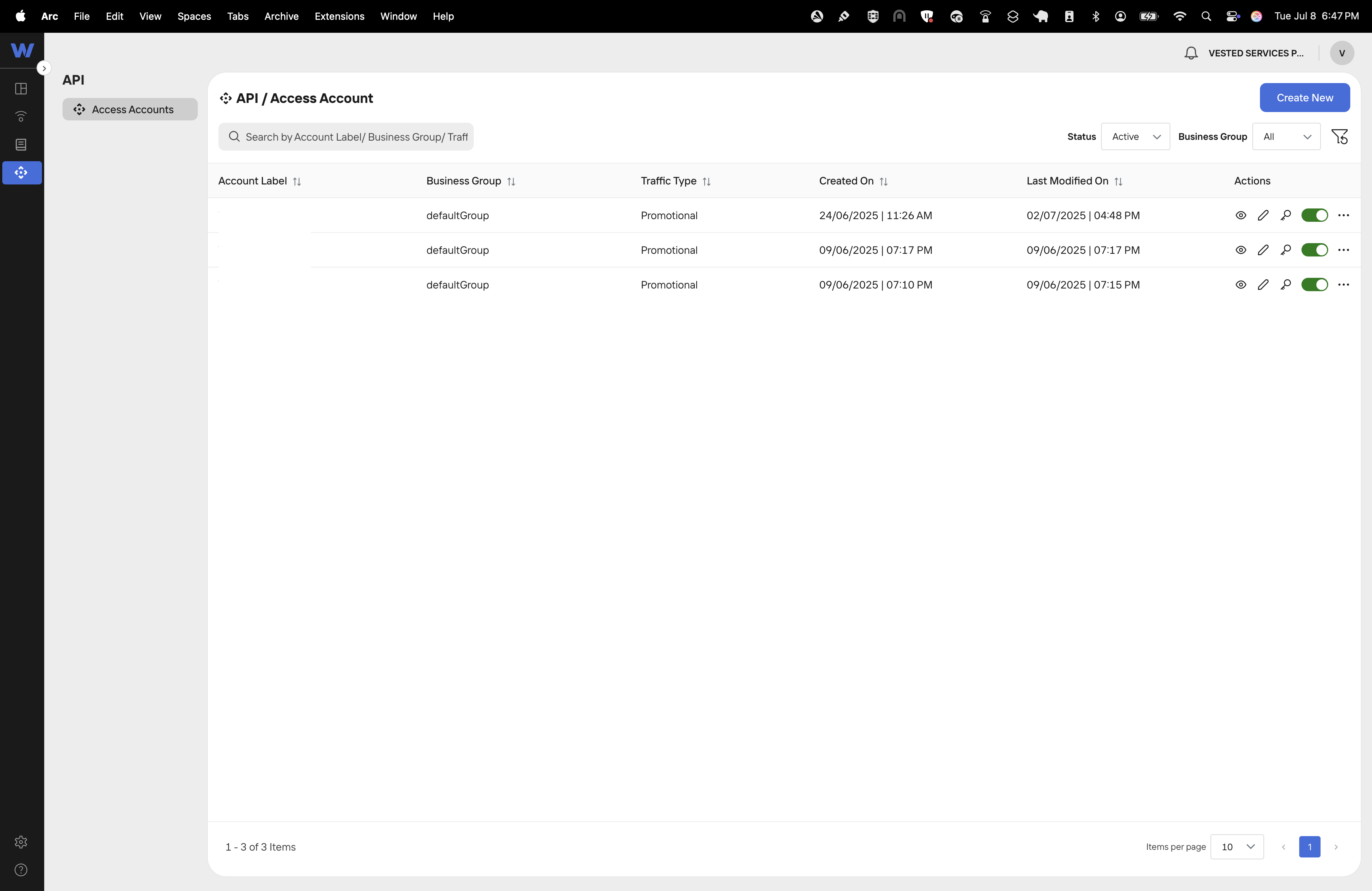 - Access Key: In your Wisely account, from left nav, go to API -> Access Accounts. Click the key icon and get the Access Key, if you already have any existing Accounts or click ‘Create New’.