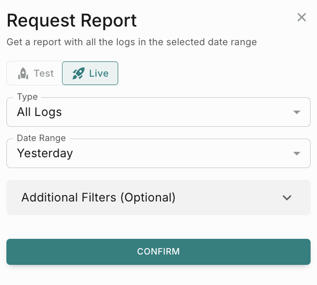 Report extraction enables you to download Sent Logs for both Live and Test environments. Reports can be extracted for yesterday, the last 7 days, the last 28 days or a custom date range (within the last 6 months).