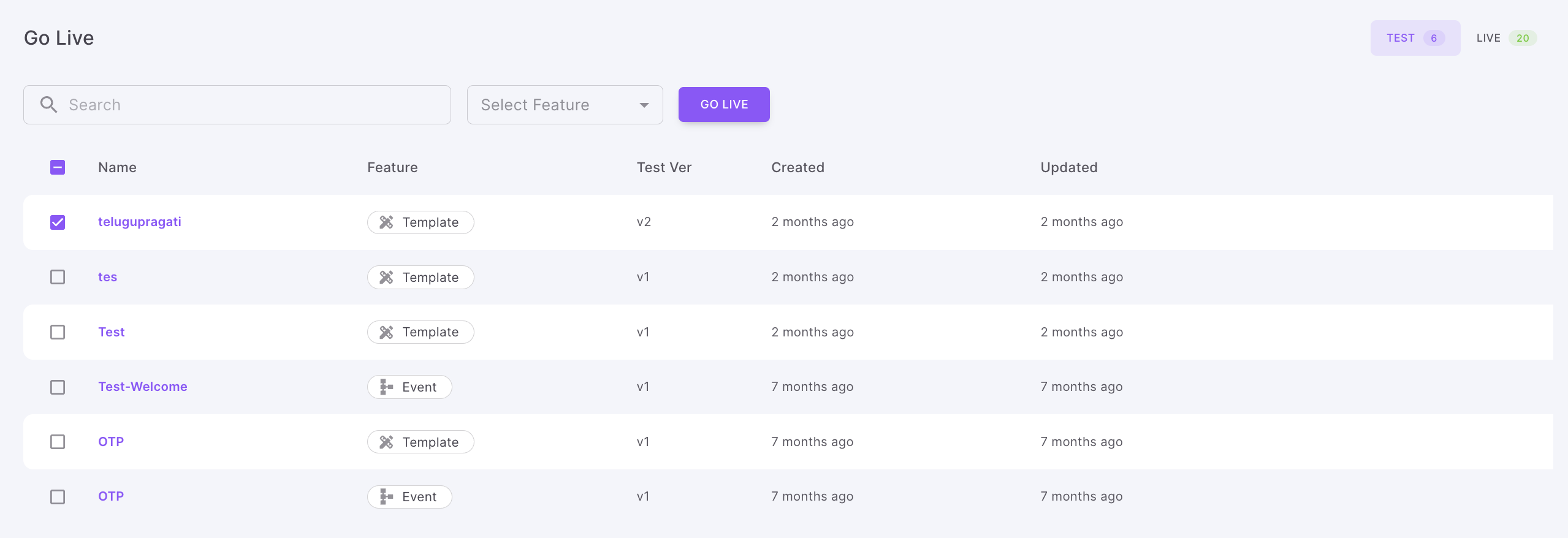 - Using the ‘Select Feature’ filter, you can select all Test versions of a particular feature and promote them to Live collectively by clicking the ‘Go Live’ CTA.