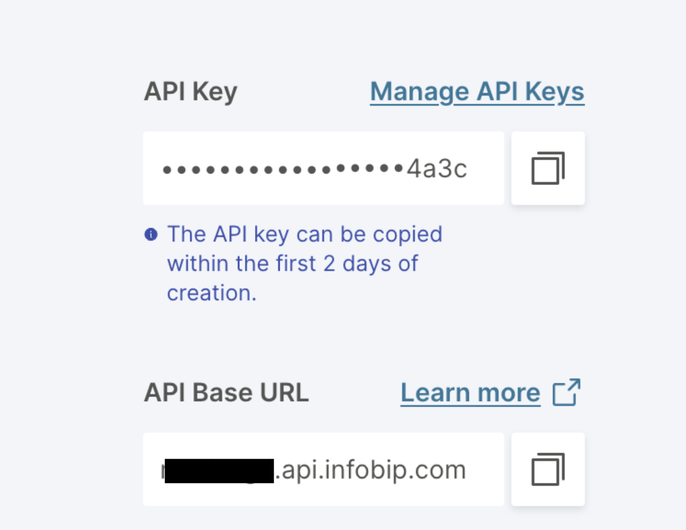 infobip Base URL: You can find it in Infobip home page as shown below. It will be in the format xxxxx.api.infobip.com.