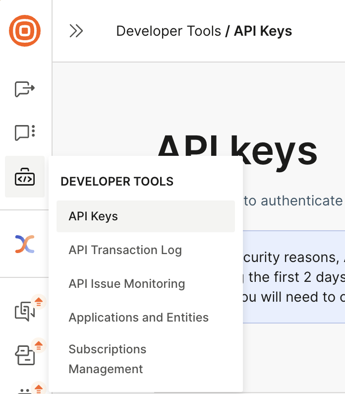 API Key: Once you login into Infobip, go to Menu -> Developer Tools -> API Key. You can either copy the API Key of a previously created one or create a new one.