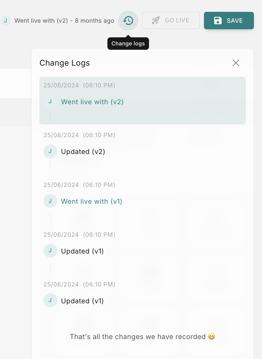To do so, locate the history icon positioned at the top right corner of the template page, as shown in the image below, and click on it to view the change logs.