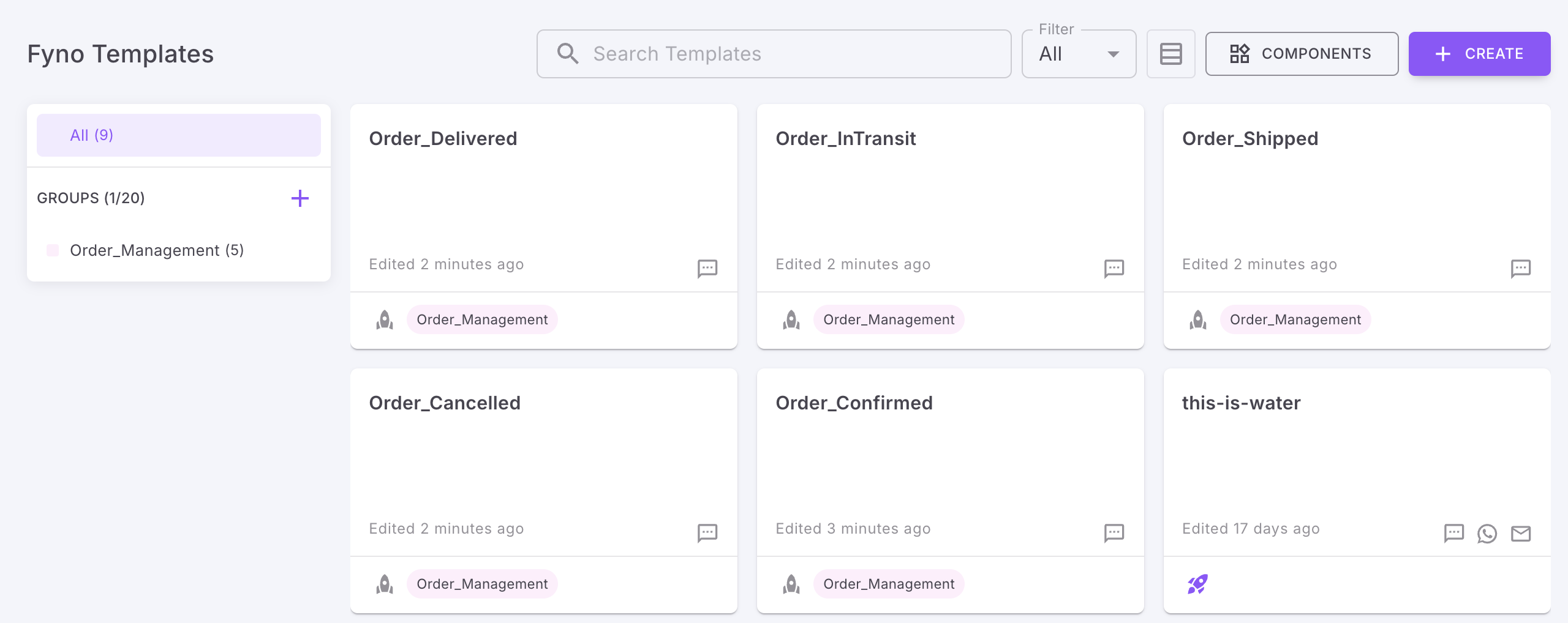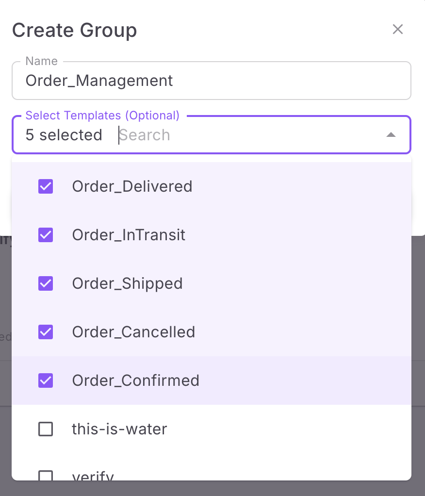 Template Groups help you organize related templates together. For instance, if you have multiple templates for different order statuses (Confirmed, Cancelled, Shipped, InTransit, Delivered), you can create an ‘Order Management’ group and assign all these templates to it. This makes template filtering and management more efficient.