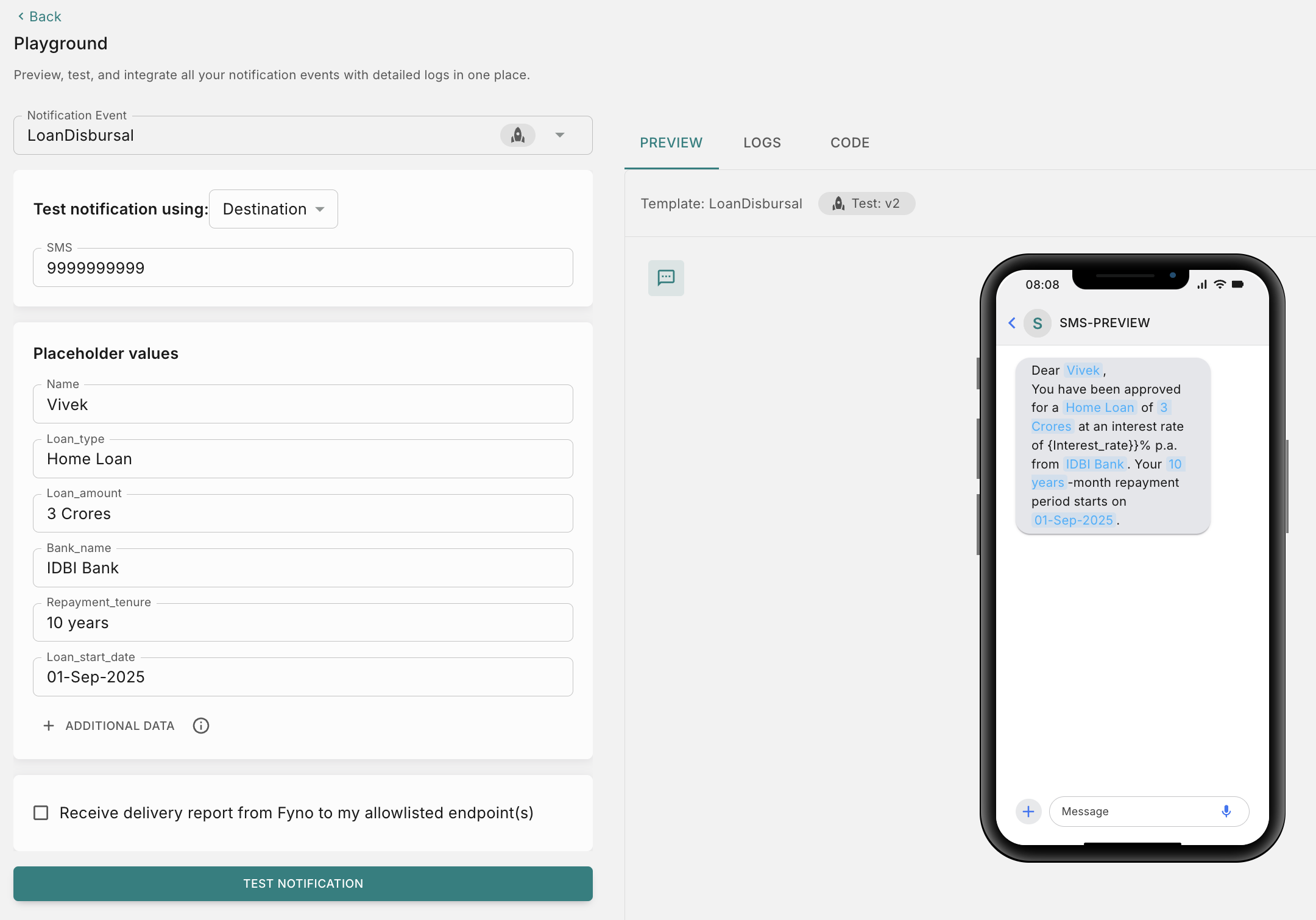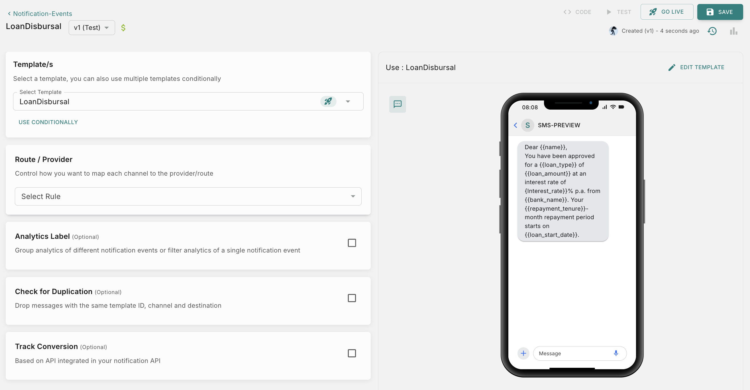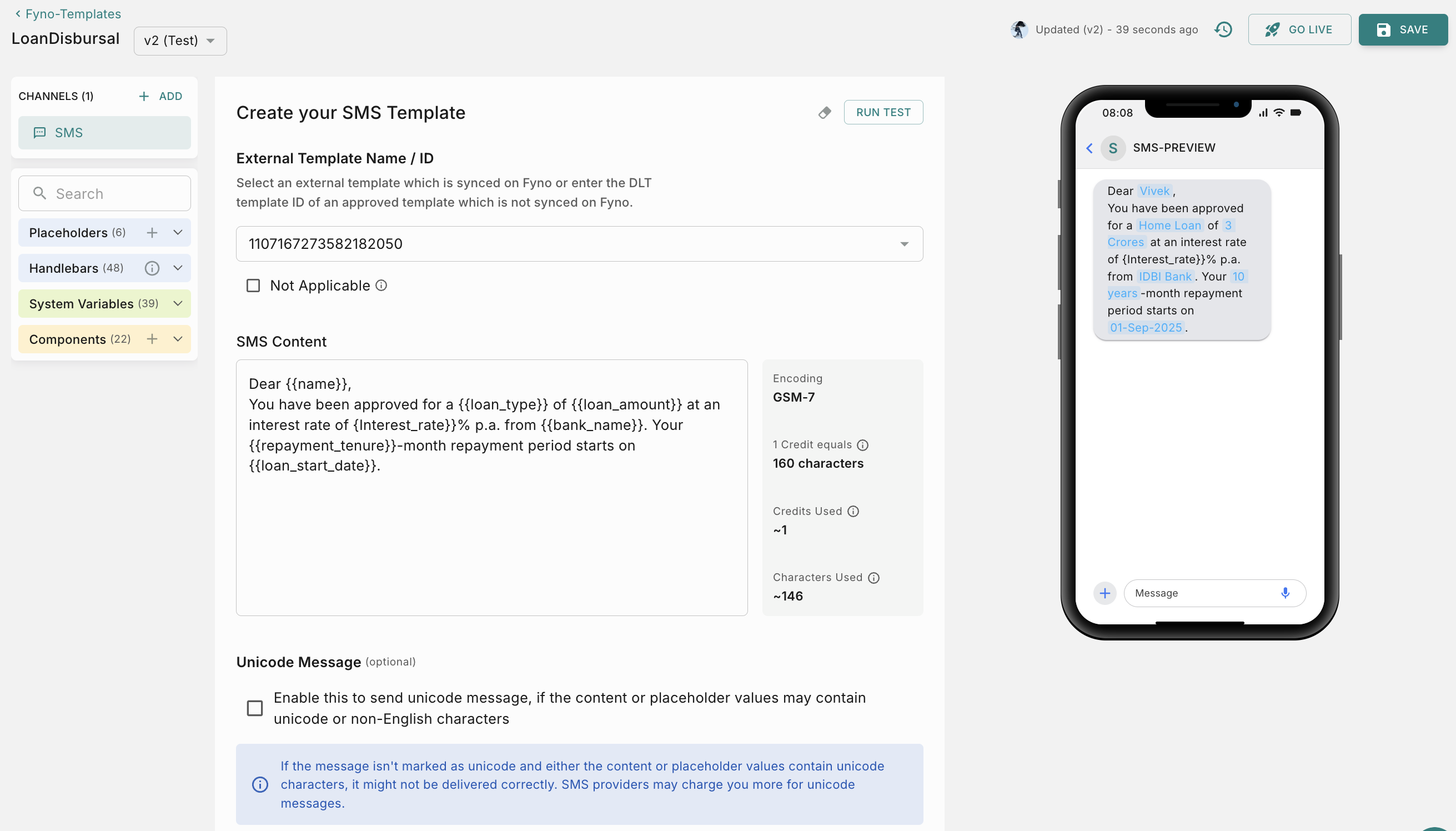 - A pre-approved SMS template created in DLT platform along with DLT Template ID.