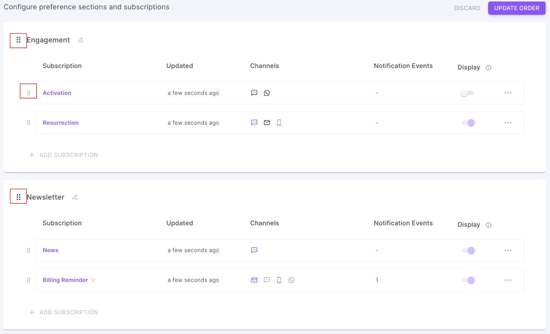This can be accomplished by creating Subscription topics that users can toggle on and off, enabling them to specify the channels through which they prefer to receive each notification.