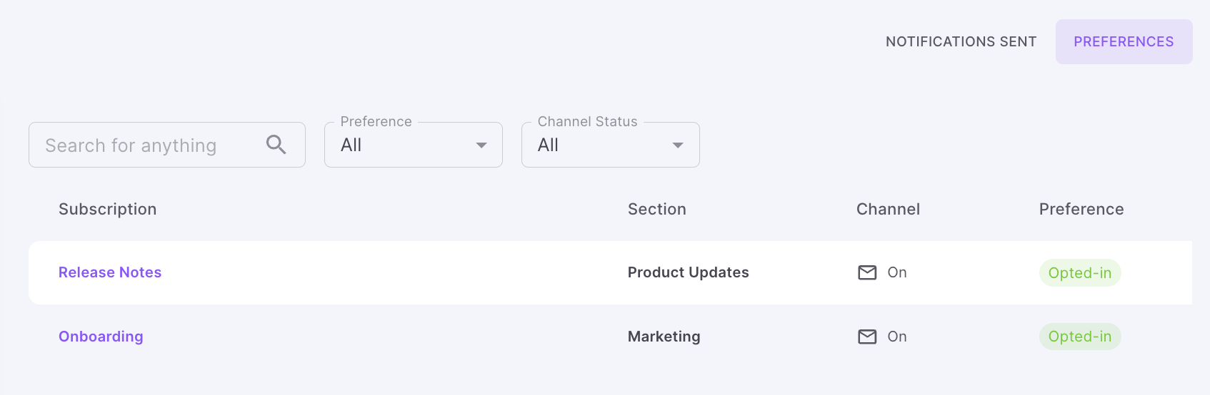 You will see the section, subscription topic, channel’s default status and the preference of the user.