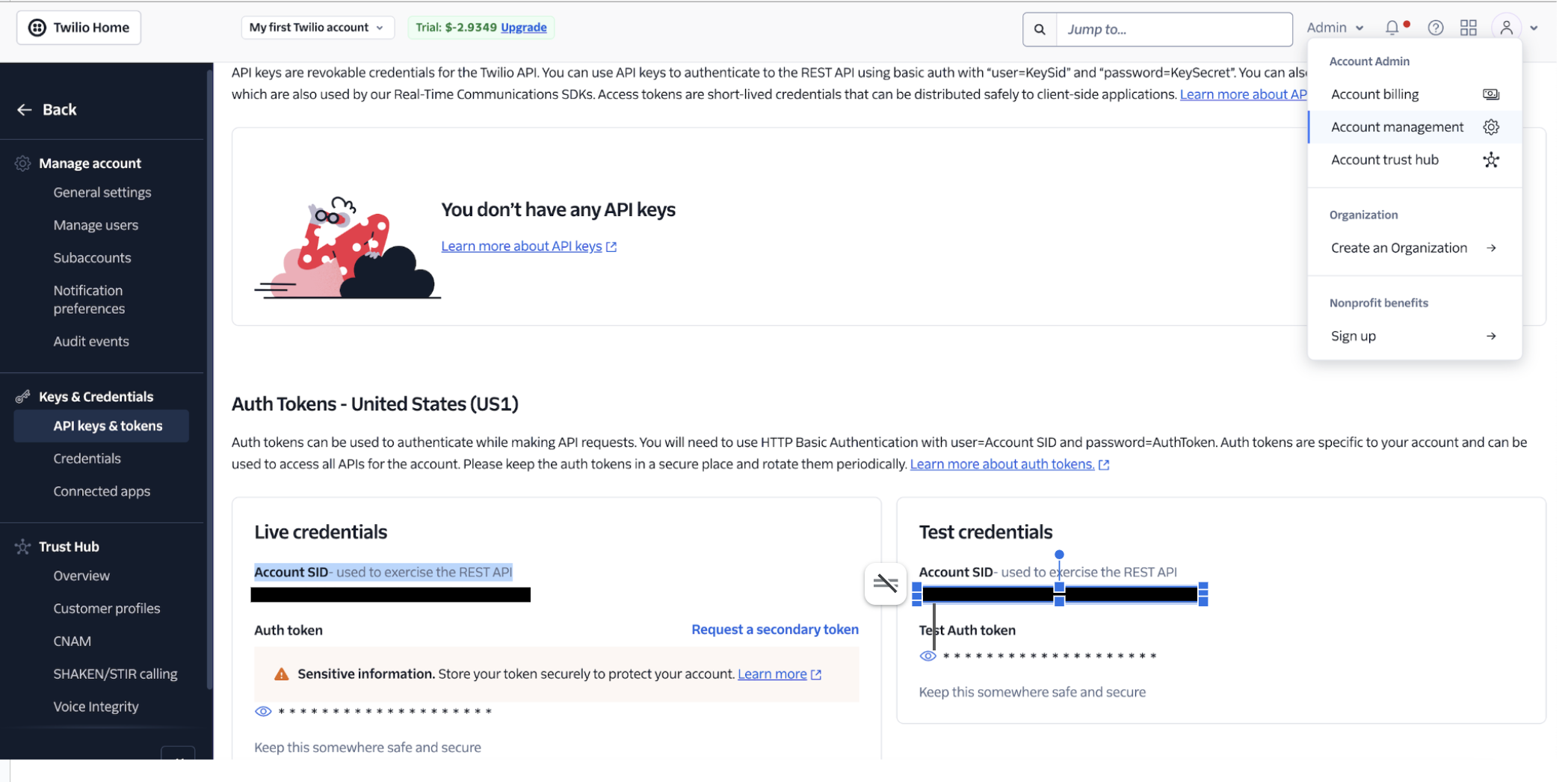 - Account SID: In your Twilio account, Under the Account tab on the top right corner, find API Keys and Tokens under Account Management. Use the eye icon to display the Account SID. Make sure to use the live credentials.
