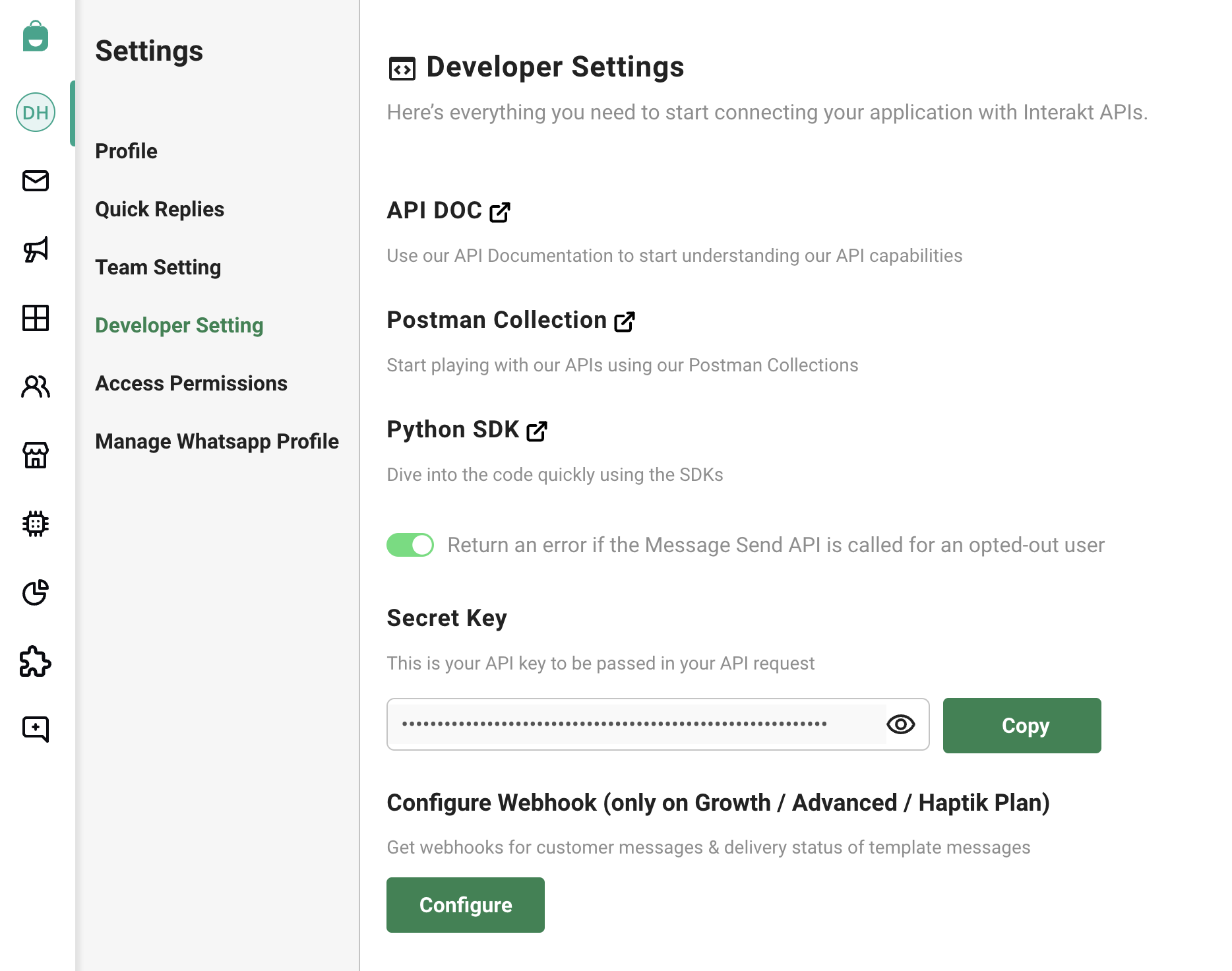 On the page that loads, enter the Callback URL provided in the popup in Webhook URL. Enter the Secret Key.