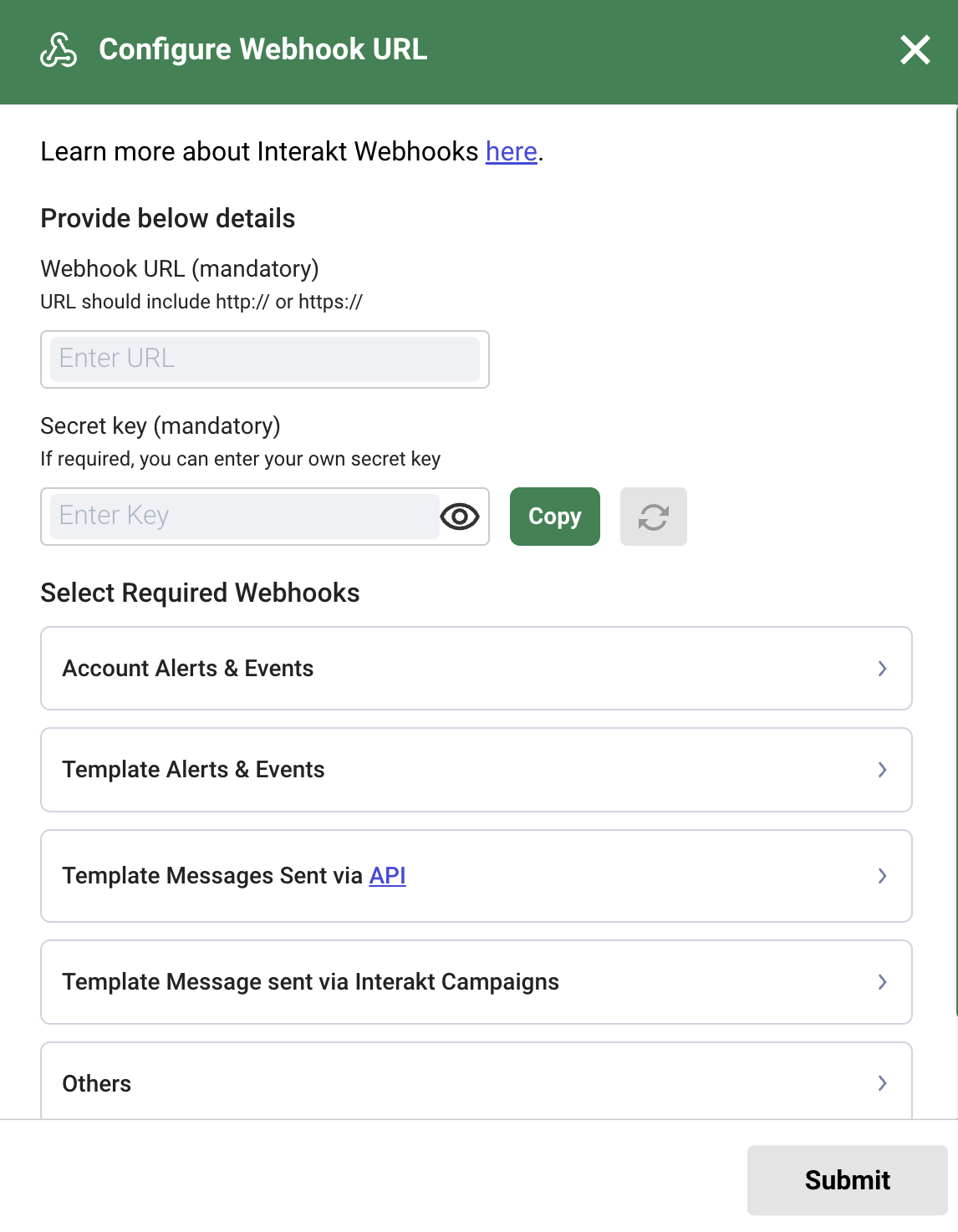Under Template Messages sent via API and Template Message sent via Interakt Campaigns, select all the required options and click Submit.