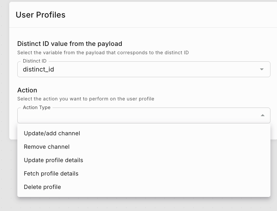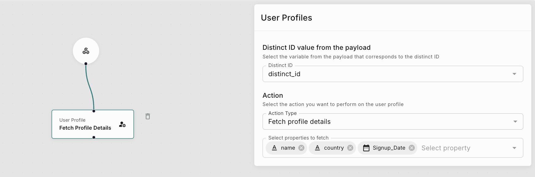 Fyno allows you to update a user profile or fetch a user profile details within a workflow. This is helpful when you need to decide what notifications to send based on a user property or Update a channel/user property linked to a profile based on the data received in the webhook.