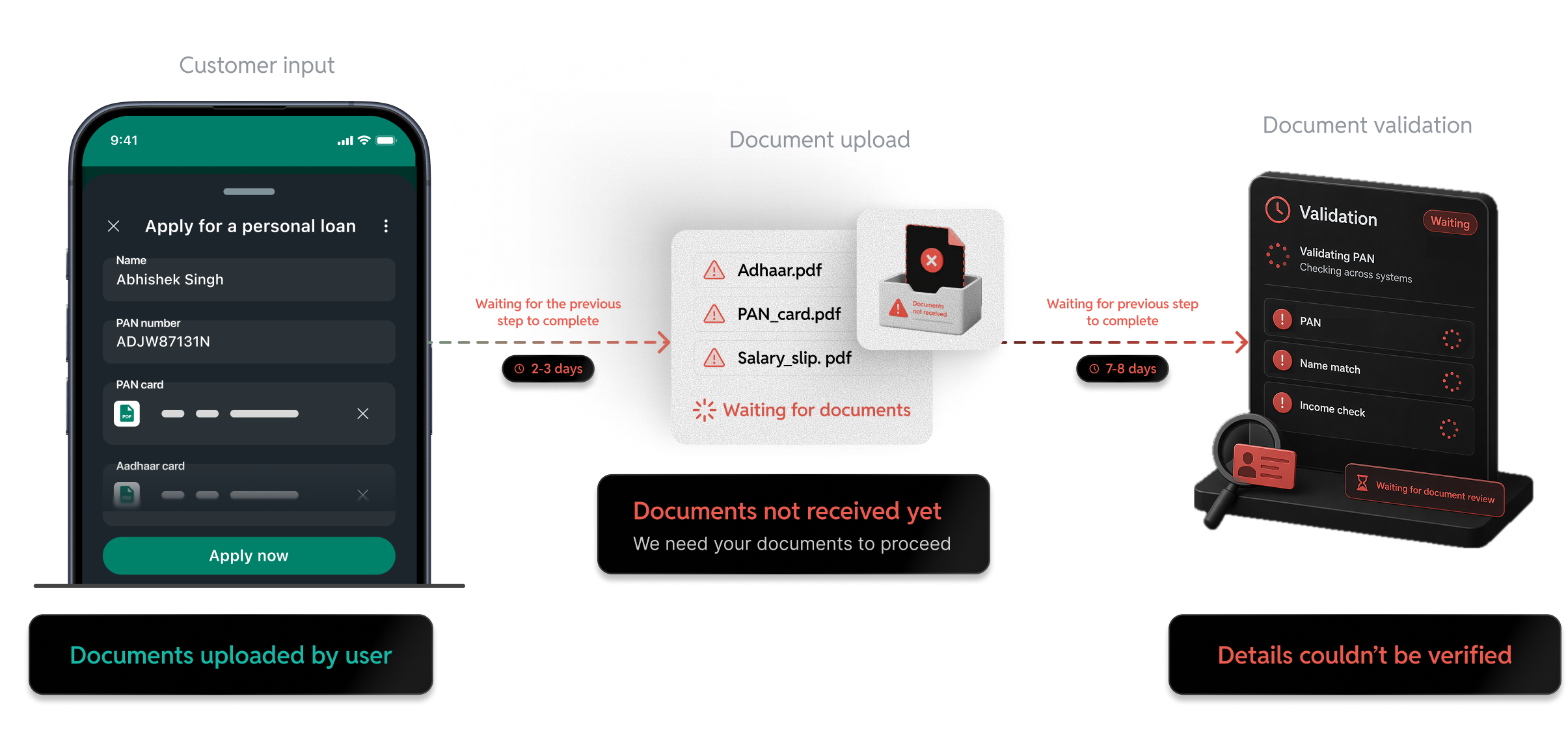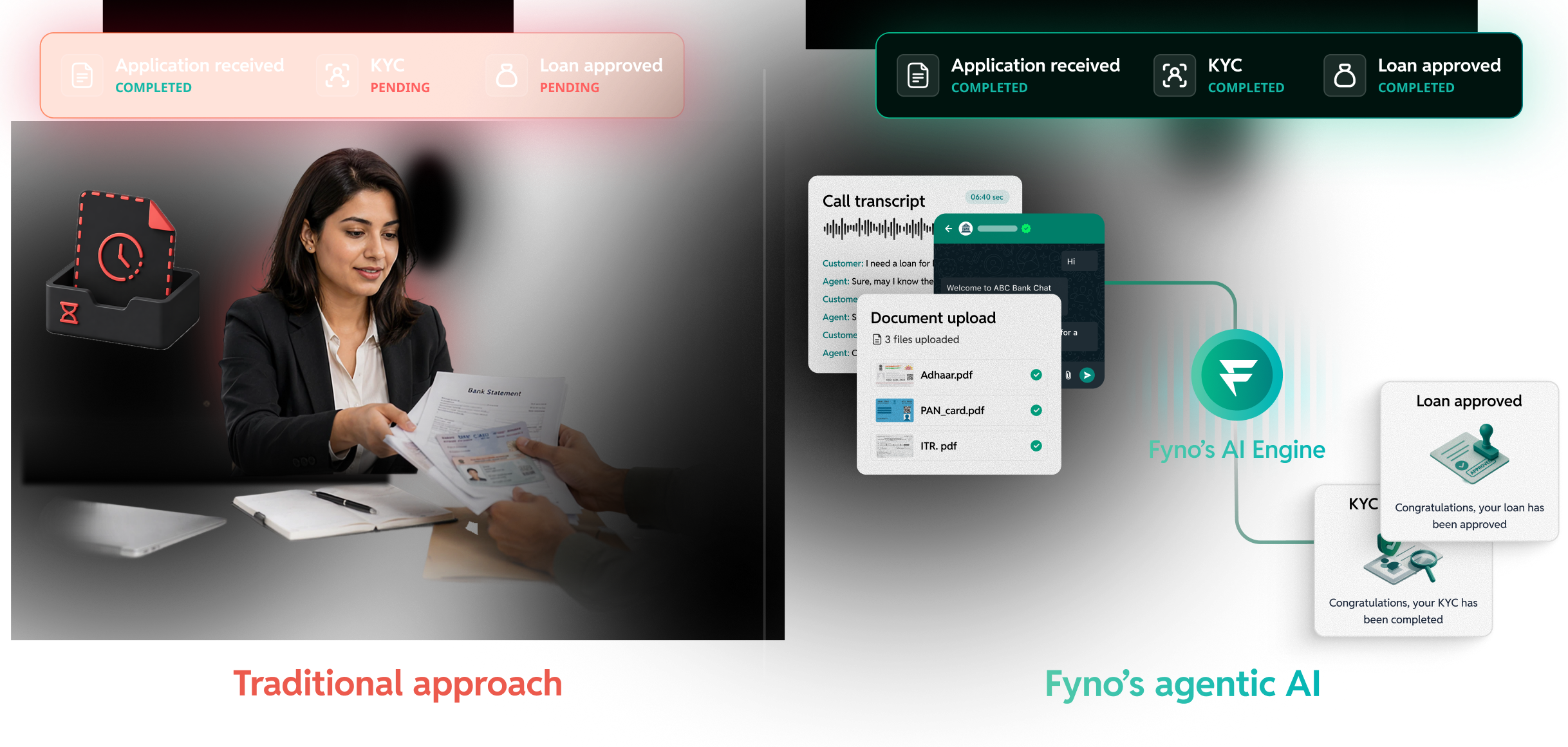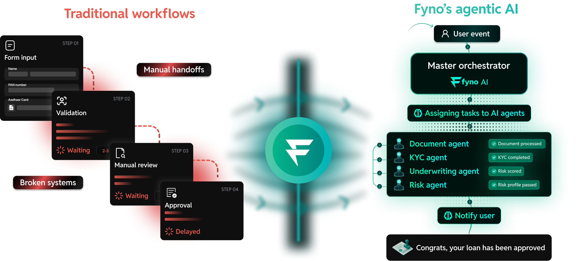 Existing tools execute fixed sequences and break the moment an input is missing, out of order, or arrives on the wrong channel. Fyno's agentic layer understands intent, runs tasks like KYC, document validation, and underwriting in parallel rather than in sequence, and continues the journey even when a customer responds partially or inconsistently. It is not a replacement for your tools, but the orchestration layer that makes them work together with minimal manual intervention.